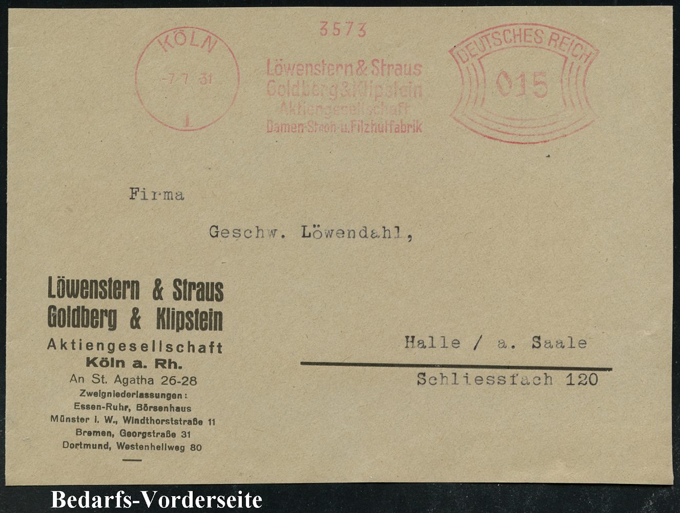 9126 | 16 € | 5000 KÖLN (Absender-Freistempel) : KÖLN/ 1/ Löwenstern & Straus/ Goldberg & Klipstein/ AG../ Damen-Stroh-u.Filzhutfabrik 1931 (7.7.) AFS Francotyp "Bogenrechteck" auf Firmen-Vorderseite = jüdische Firma! (Dü.E-1CAh) | ![]() | |