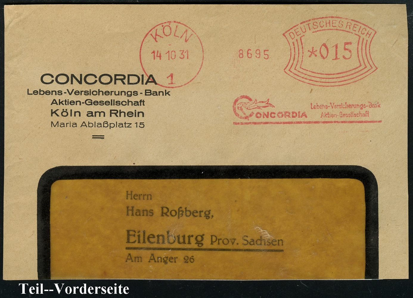 9127 | 14 € | 5000 KÖLN (Absender-Freistempel) : KÖLN/ 1/ CONCORDIA/ Lebens-Versicherung-Bank/ AG 1931 (14.10.) AFS Francotyp "Bogenrechteck" (Firmenlogo: Fackel) Teil-Vorderseite (Dü.E-1Am) | ![]() | |