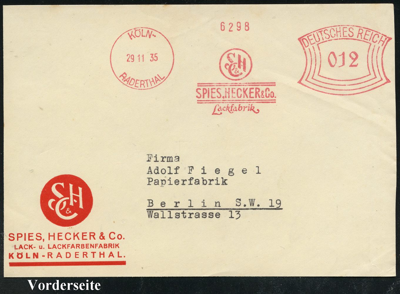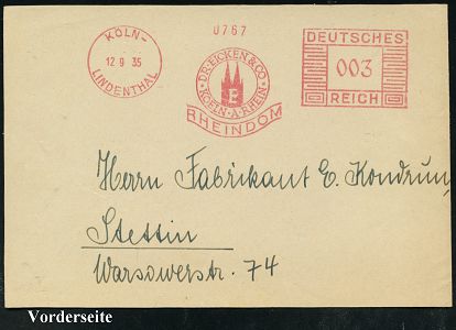 9175 | 16 € | 5000 KÖLN (Absender-Freistempel) : KÖLN-/ LINDENTHAL/ DR.EICKEN & CO../ RHEINDOM 1935 (12.9.) AFS Francotyp "Mäanderrechteck" (Firmen-Logo mit Kölner Dom) Bedarfs-Vorderseite (Dü.E-2CEh) | ![]() | |