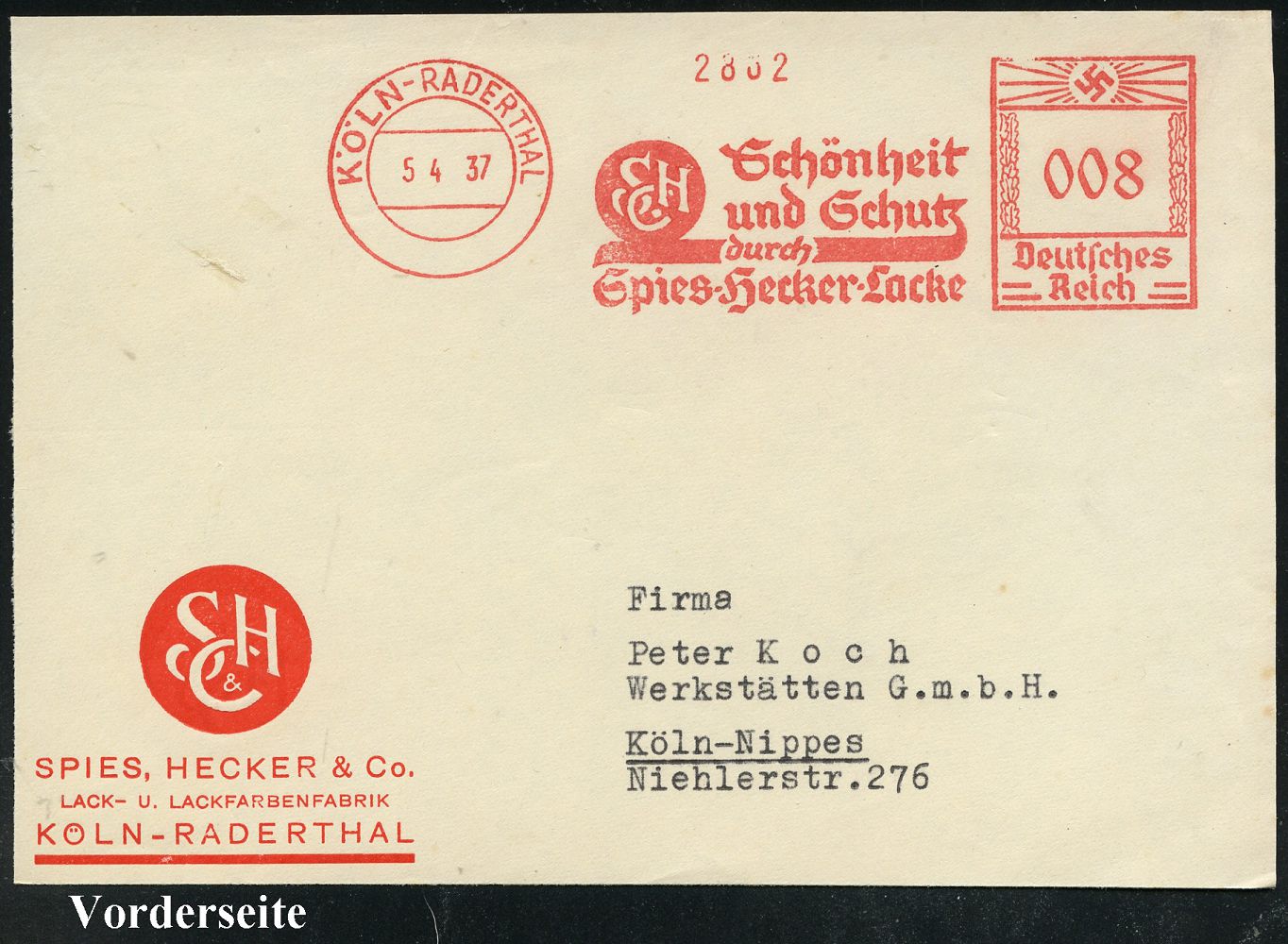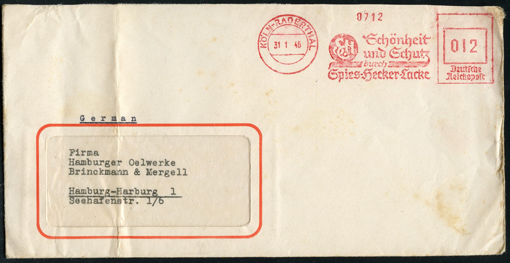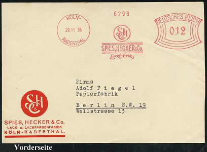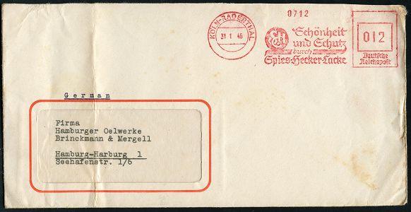 9272 | 25 € | 5000 KÖLN (Absender-Freistempel) : KÖLN-RADERTHAL/ SHC/ Schönheit/ und Schutz/ Spies-Hecker-Lacke 1946 (31.1.) aptierter AFS Francotyp "Reichsadler" = entfernt = Notmaßnahme! (Monogr.-Logo) rs. Abs.-Vordruck, Fern-Bf. (links gefaltet, rechter Rand etw. uneben) n. Hamburg (Dü.E-13 J-129h) | ![]() | |