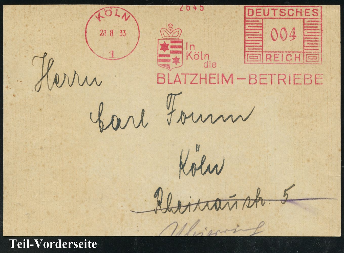 9143 | 15 € | 5000 KÖLN (Absender-Freistempel) : KÖLN/ 1/ In/ Köln/ die/ BLATZHEIM-BETRIEBE 1933 (28.8.) AFS Francotyp "Mäanderrechteck" (Firmen-Logo) = Hotel- u. Gastronomie-Betrieb, Bedarfs-Vorderseite (Dü.E-2CEh) | ![]() | |