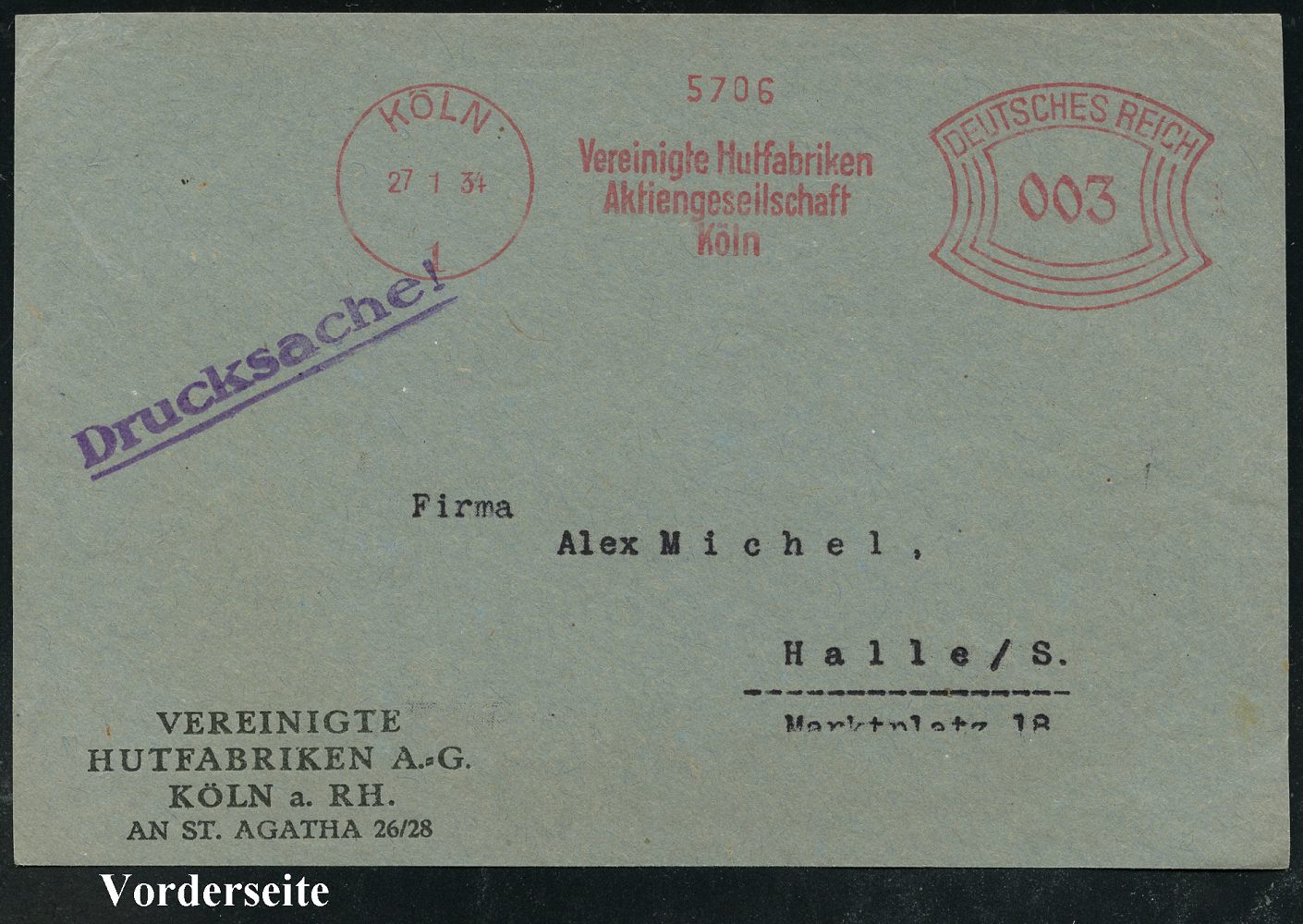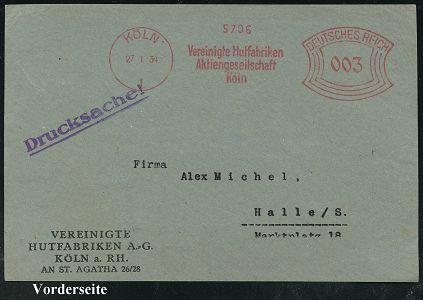 9149 | 15 € | 5000 KÖLN (Absender-Freistempel) : KÖLN/ 1/ Vereinigte Hutfabriken/ AG.. 1934 (27.1.) AFS Francotyp "Bogenrechteck" auf Bedarfs-Vorderseite (Dü.E-1CAh) | ![]() | |