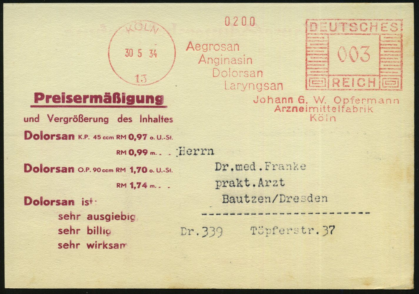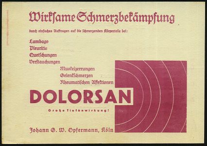 9151 | 22 € | 5000 KÖLN (Absender-Freistempel) : KÖLN/ 13/ Aegrosan/ Anginasin/ Dolorsan../ Johann G. W.Opfermann/ Arzneimittelfabrik.. 1934 (30.5.) AFS Francotyp "Mäanderrechteck" auf monochromer Reklame-Kt.: Dolorsan.. Wirksame Schmerzbekämpfung.. (Schmerzwellen), Fern-Kt., vergl. Kat.-Nr. 9146 (Dü.E-2CEh) | ![]() ![]() | |