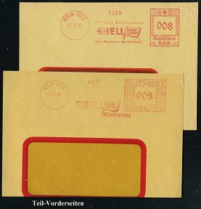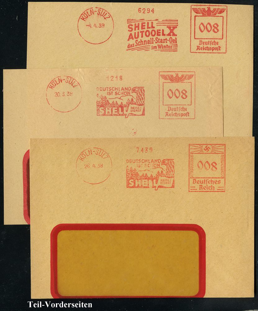 9154 | 30 € | 5000 KÖLN (Absender-Freistempel) : KÖLN-SÜLZ/ SHELL.. 1934/39 5 verschiedene AFS Francotyp "Mäanderrechteck", "Hakenkreuz" (2) bzw. "Reichsadler" (2) je auf Teil-Vorderseite, 5 Belege (Dü.E-2BAh, E-3BAh (2x), E-5BAh (2x)) | ![]() ![]() | |