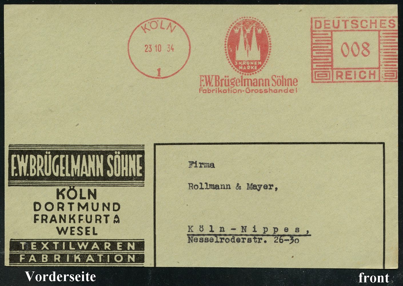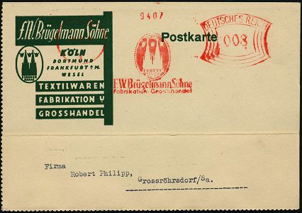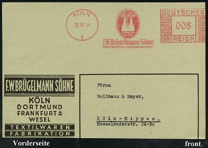 9155 | 15 € | 5000 KÖLN (Absender-Freistempel) : KÖLN/ 1/ 3 KRONEN/ MARKE/ F.W.Brügelmann Söhne.. 1934 (23.10.) AFS Francotyp "Mäanderrechteck" (Firmen-Logo mit Kölner Dom u. 3 Kronen für die Hl. 3 Könige) Bedarfs-Vorderseite = Textil-Firma vergl. Kat.-Nr.9129 (Dü.E-2CEo) | ![]() | |