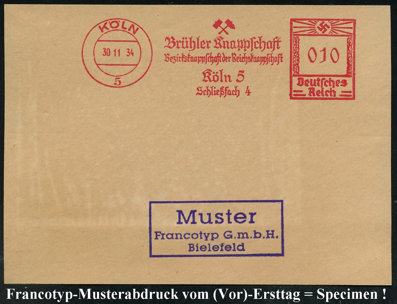 9158 | 35 € | 5000 KÖLN (Absender-Freistempel) : KÖLN/ 5/ Brühler Knappschaft/ ..der Rheinknappschaft.. 1934 (30.11.) AFS-Musterabdruck Francotyp "Hakenkreuz" (2 Bergbauhämmer) glasklar gest. Francotyp-Musterblatt vom (Vor)-Ersttag !, selten! (Dü.E-3CEo) | ![]() ![]() | |