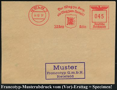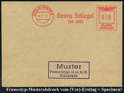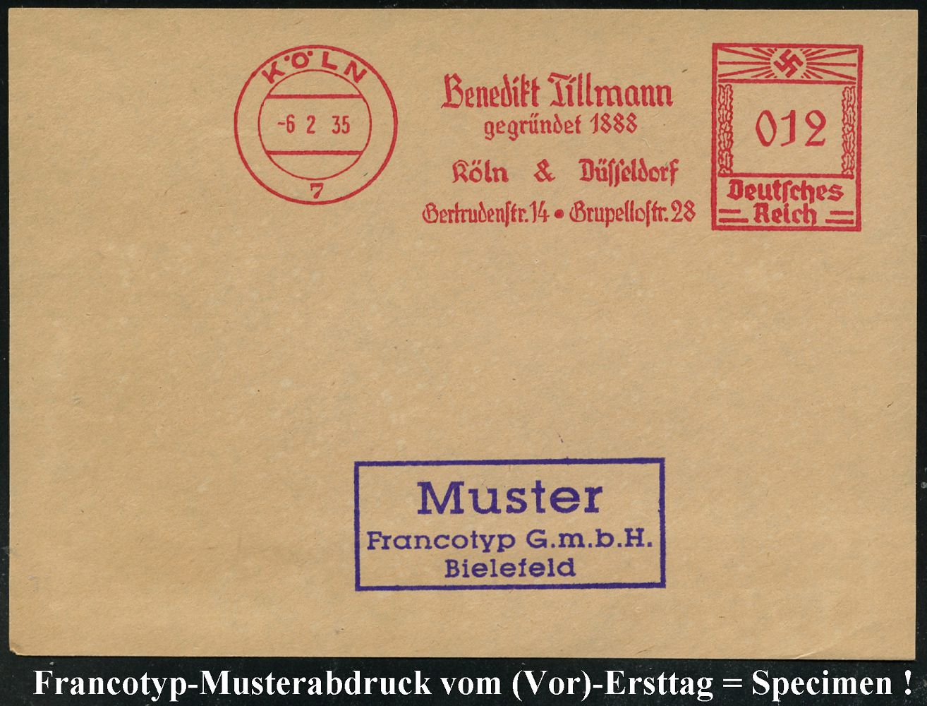 9161 | 35 € | 5000 KÖLN (Absender-Freistempel) : KÖLN/ 7/ Benedikt Tillmann/ gegr.1888/ Köln & Düsseldorf... 1935 (6.2.) AFS-Musterabdruck Francotyp "Hakenkreuz" , glasklar gest. Francotyp-Musterblatt vom (Vor)-Ersttag !, selten! (Dü.E-3CEo) | ![]() ![]() | |