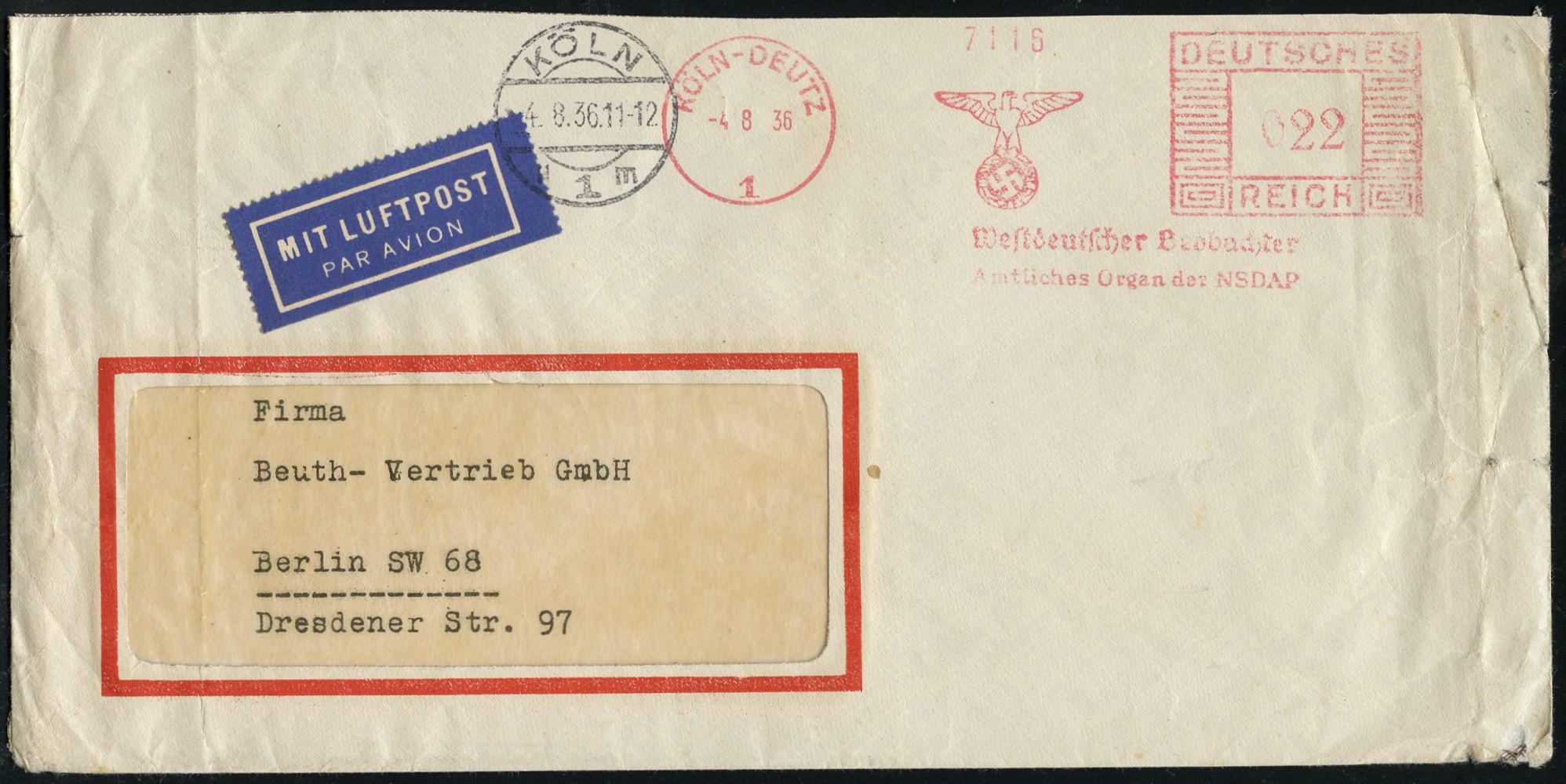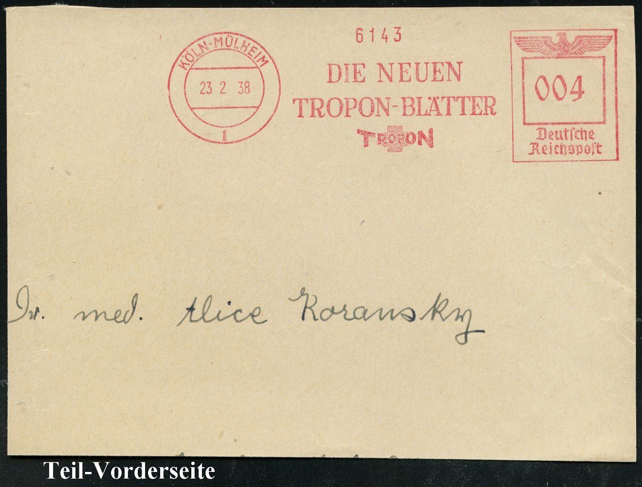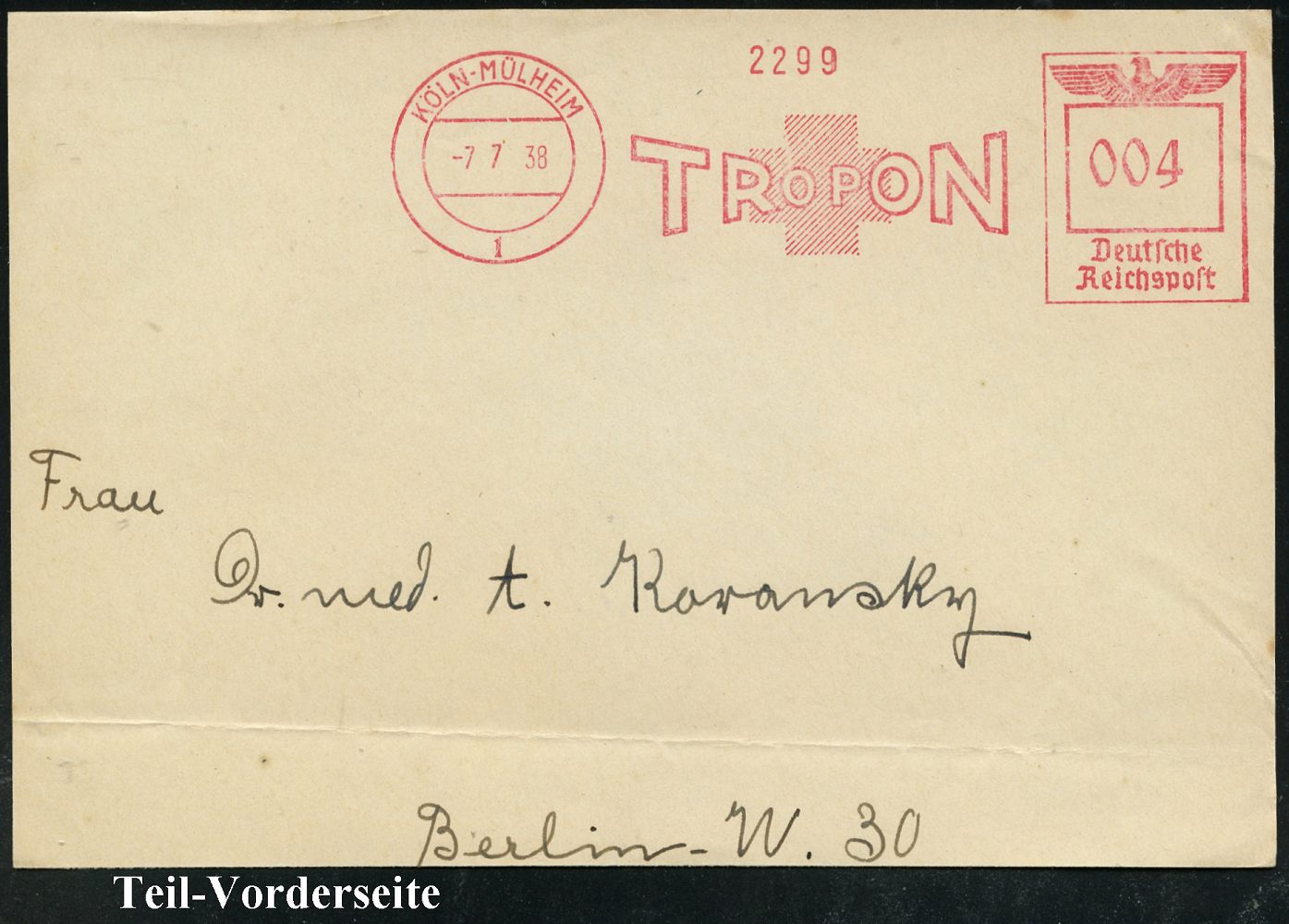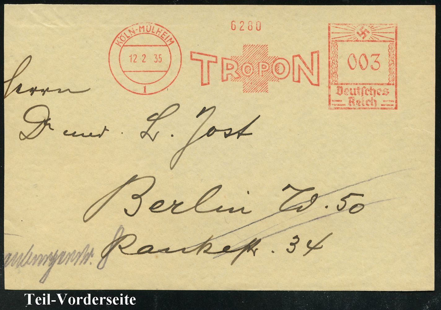9163 | 30 € | 5000 KÖLN (Absender-Freistempel) : KÖLN-MÜLHEIM/ 1/ TROPON 1935/38 3 verschiedene AFS Francotyp "Hakenkreuz" bzw. "Reichsadler" (je Firmen-Logo mit rotem Kreuz = Pharma-Firma Dinklage & Co.) je auf Teil-Vorderseite, 3 Belege (Dü.E-3CEh, E-5CEh 2x) | ![]() ![]() ![]() | |