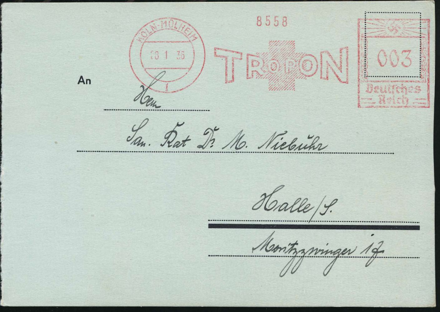 9165 | 25 € | 5000 KÖLN (Absender-Freistempel) : KÖLN-MÜLHEIM/ 1/ TROPON 1936 (28.1.) AFS Francotyp "Hakenkreuz" (Logo mit Rotem Kreuz) auf zweifarbiger Color-Reklame-Ak.: ARSEN-EISENTROPON.. Blutregenerationsmittel (Dü.E-3CEh) | ![]() ![]() | |