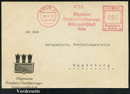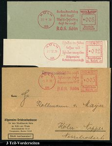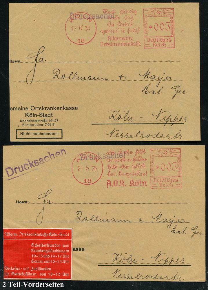 9169 | 30 € | 5000 KÖLN (Absender-Freistempel) : KÖLN/ 18/ A.O.K. Köln.. #bzw.# Allgemeine/ Ortskrankenkasse 1935/38 5 verschiedene AFS Francotyp "Hakenkreuz" mit verschiedenen Werbetexten, alle in Sütterlin ! , je auf Teil-Vorderseite, 1x rote Werbevignette mit Schalterstunden, 5 Belege (Dü.E-3Ao mit Punkt, 4x, Dü.E-5Ao mit Punkt) | ![]() ![]() | |