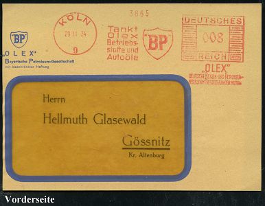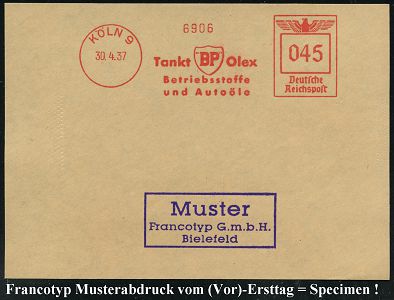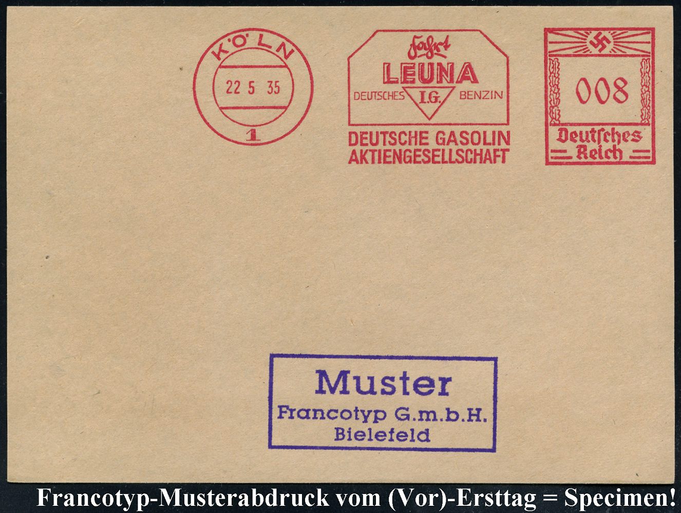 9170 | 35 € | 5000 KÖLN (Absender-Freistempel) : KÖLN/ 1/ Fahrt/ LEUNA/ DEUTSCHES I.G. BENZIN/ DEUTSCHE GASOLIN/ AG 1935 (22.5.) AFS-Musterabdruck Francotyp "Hakenkreuz" , teils Sütterlin, glasklar gest. Francotyp-Musterblatt vom (Vor)-Ersttag !, selten! (Dü.E-3CEo) | ![]() ![]() | |