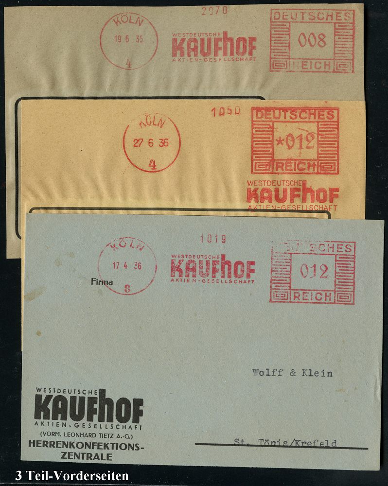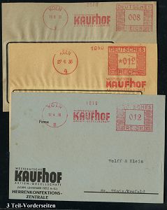 9171 | 18 € | 5000 KÖLN (Absender-Freistempel) : KÖLN/ 4 #bzw.# 8/ WESTDEUTSCHE/ KAUFHOF/ AG 1935/36 3 verschiedene AFS Francotyp "Mäanderrechteck" , je auf kleiner Vorderseite, 3 Belege (Dü-E-CEh, E-2Ah) | ![]() | |