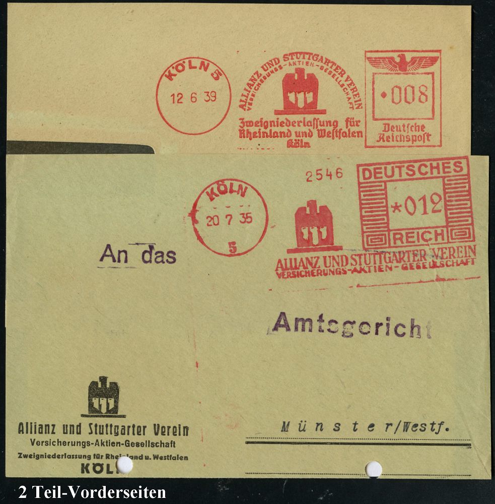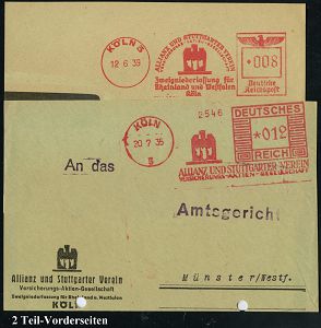 9173 | 18 € | 5000 KÖLN (Absender-Freistempel) : KÖLN/ 5/ ALLIANZ UND STUTTGARTER VEREIN/ VERSICHERUNGS-AG 1935/39 2 verschiedene AFS Francotyp "Mäanderrechteck" bzw. "Reichsadler" (je Firmen-Logo) je auf Teil-Vorderseite, 2 Belege (Dü.E-2Ah, E-2DGo) | ![]() | |