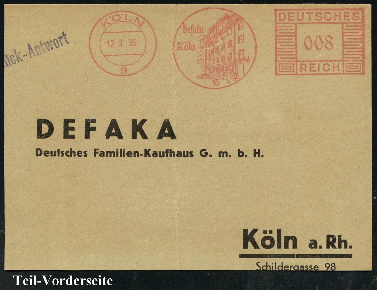 9174 | 15 € | 5000 KÖLN (Absender-Freistempel) : KÖLN/ 9/ Defaka/ Köln 1935 (12.9.) AFS Francotyp "Mäanderrechteck" (Deutsches Familian-Kaufhaus) auf Bedarfs-Vorderseite (Dü.E-2CEo) | ![]() | |