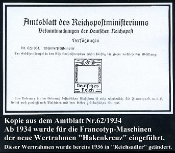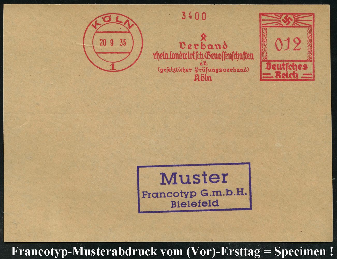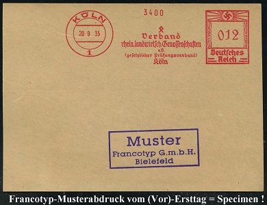 9176 | 35 € | 5000 KÖLN (Absender-Freistempel) : KÖLN/ 1/ Verband/ rhein.landwirtsch.Genossenschaften/ e.V./ (gesetzlicher Prüfungsverband)/ Köln 1935 (20.9.) AFS-Musterabdruck Francotyp "Hakenkreuz" (Lebens-Rune) glasklar gest. Francotyp-Musterblatt vom (Vor)-Ersttag !, selten! (Dü.E-3CEh) | ![]() ![]() | |