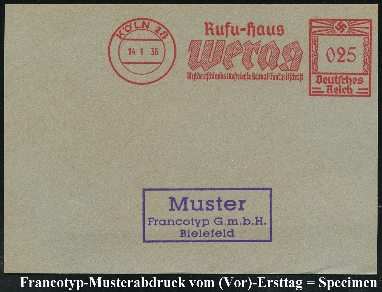 9180 | 35 € | 5000 KÖLN (Absender-Freistempel) : KÖLN 18/ Rufu-Haus/ werag/ Westdeutschlands illustrierte Heimat-Funk-Zeitschrift 1936 (14.1.) AFS-Musterabdruck Francotyp "Hakenkreuz" , glasklar gest. Francotyp-Musterabdruck vom (Vor)-Ersttag !, selten! (Dü.E-3CEo) | ![]() ![]() | |