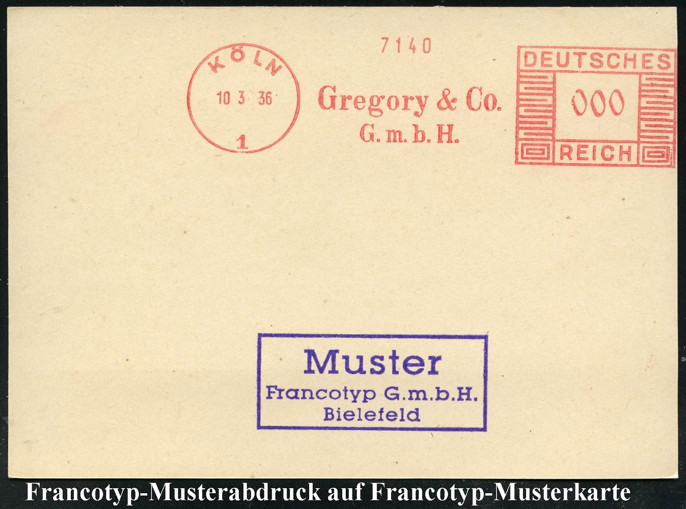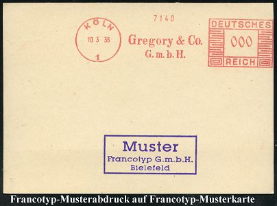 9186 | 25 € | 5000 KÖLN (Absender-Freistempel) : KÖLN/ 1/ Gregory & Co./ GmbH 1936 (10.3.) AFS-Musterabdruck Francotyp "Mäanderrechteck" in 000 , klar gest. Francotyp-Musterabdruck (Dü.E-2CEh) | ![]() ![]() | |