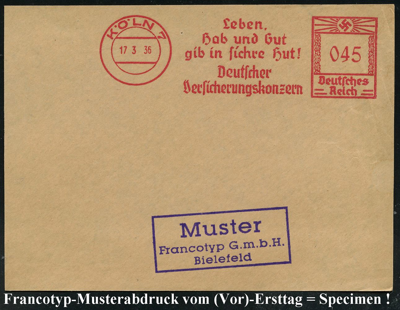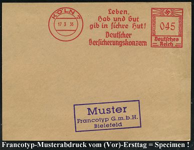 9187 | 35 € | 5000 KÖLN (Absender-Freistempel) : KÖLN 7/ Leben,/ Hab u.Gut/ gib in sichere Hut!/ Deutscher/ Versicherungskonzern 1936 (17.3.) AFS-Musterabdruck Francotyp "Hakenkreuz" , glasklar gest. Francotyp-Musterblatt vom (Vor)-Ersttag !, selten! (Dü.E-3CEo) | ![]() ![]() | |