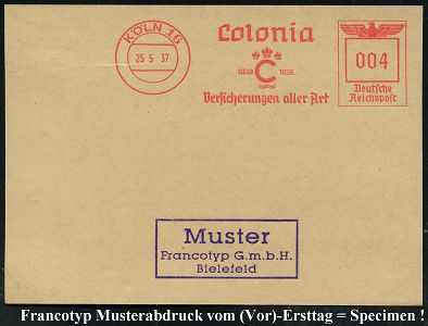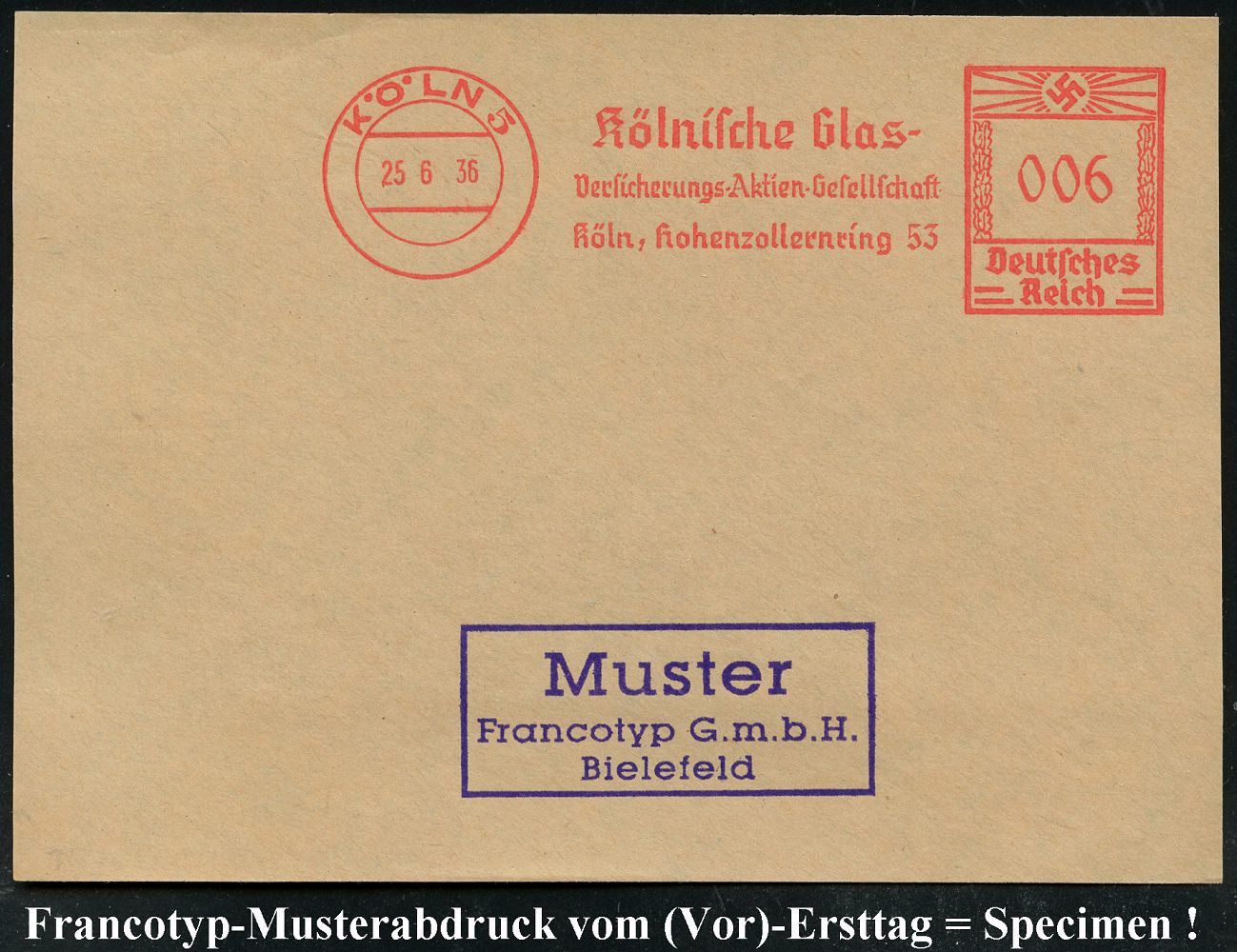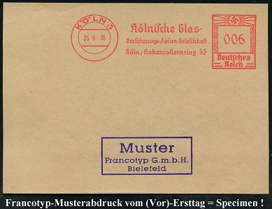 9188 | 35 € | 5000 KÖLN (Absender-Freistempel) : KÖLN 5/ Kölnische Glas-/ Versicherungs-AG/ Köln.. 1936 (25.6.) AFS-Musterabdruck Francotyp "Hakenkreuz" , glasklar gest. Francotyp-Musterblatt vom (Vor)-Ersttag !, selten! (Dü.E-3CEo) | ![]() ![]() | |