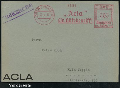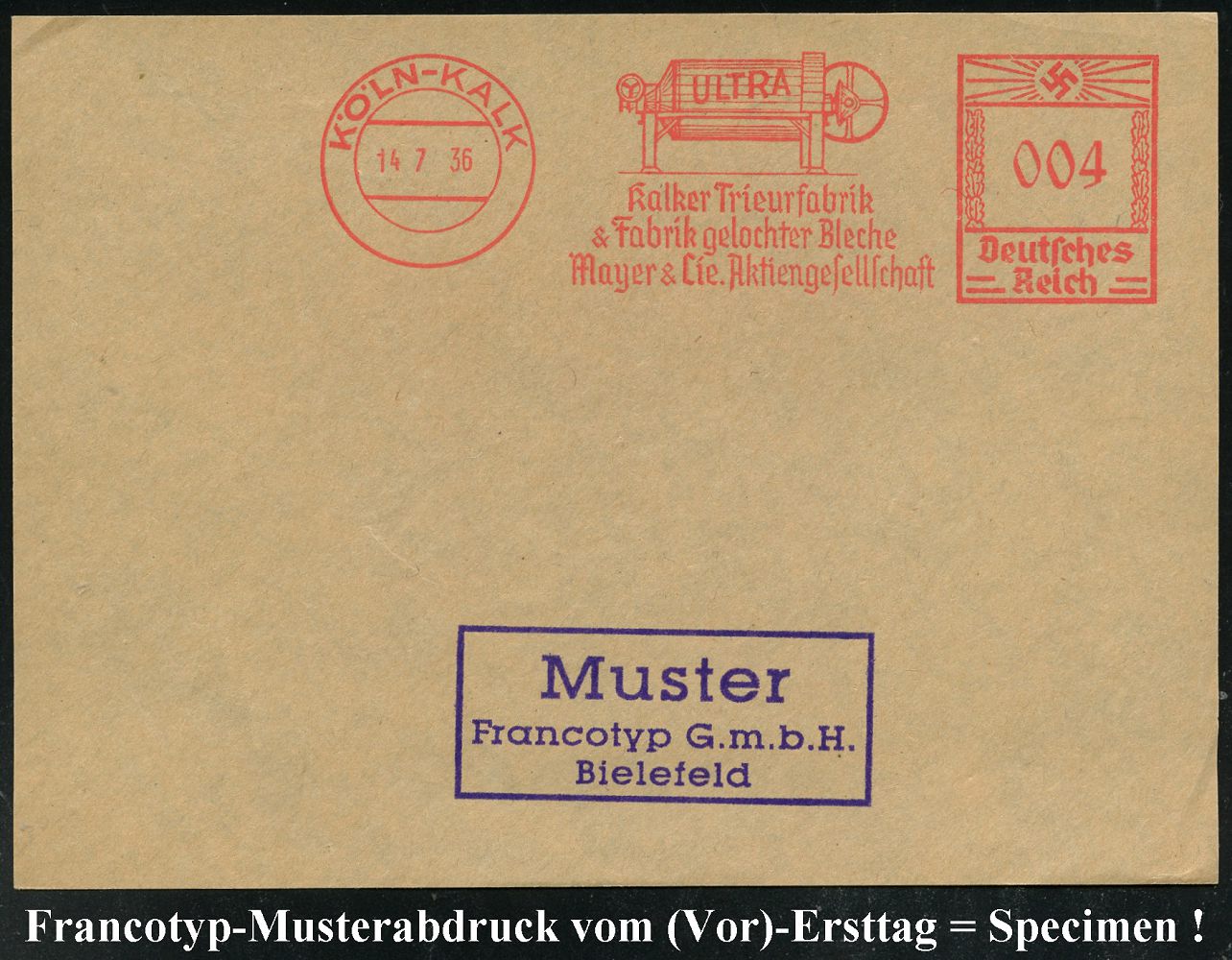 9189 | 35 € | 5000 KÖLN (Absender-Freistempel) : KÖLN-KALK/ ULTRA/ Kalker Trieurfabrik/ & Fabrik gelochter Bleche/ Mayer & Cie.. 1936 (14.7.) AFS Francotyp-Musterabdruck "Hakenkreuz" (techn. Trommel-Gerät) glasklar gest. Francotyp-Musterblatt vom (Vor)-Ersttag !, selten! (Dü.E-3CEo) | ![]() ![]() | |
