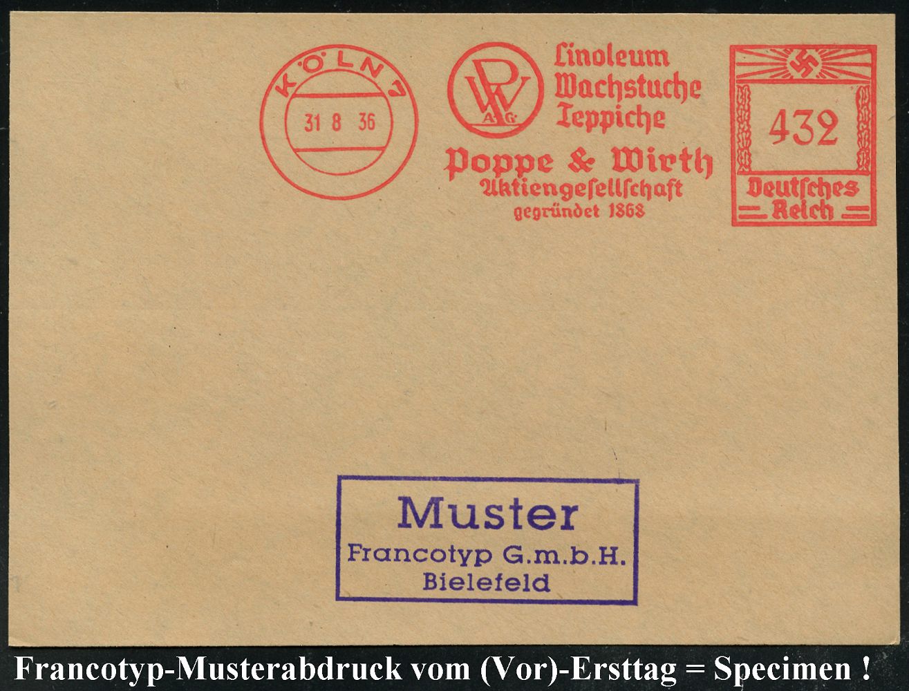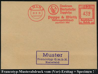 9193 | 35 € | 5000 KÖLN (Absender-Freistempel) : KÖLN 7/ PW AG/ Linoleum/ Wachstuche/ Teppiche/ Poppe & Wirth/ AG.. 1936 (31.8.) AFS-Musterabdruck Francotyp "Hakenkreuz" (Monogr.-Logo) glasklar gest. Francotyp-Musterblatt vom (Vor)-Ersttag !, selten! (Dü.E-3CEo) | ![]() ![]() | |