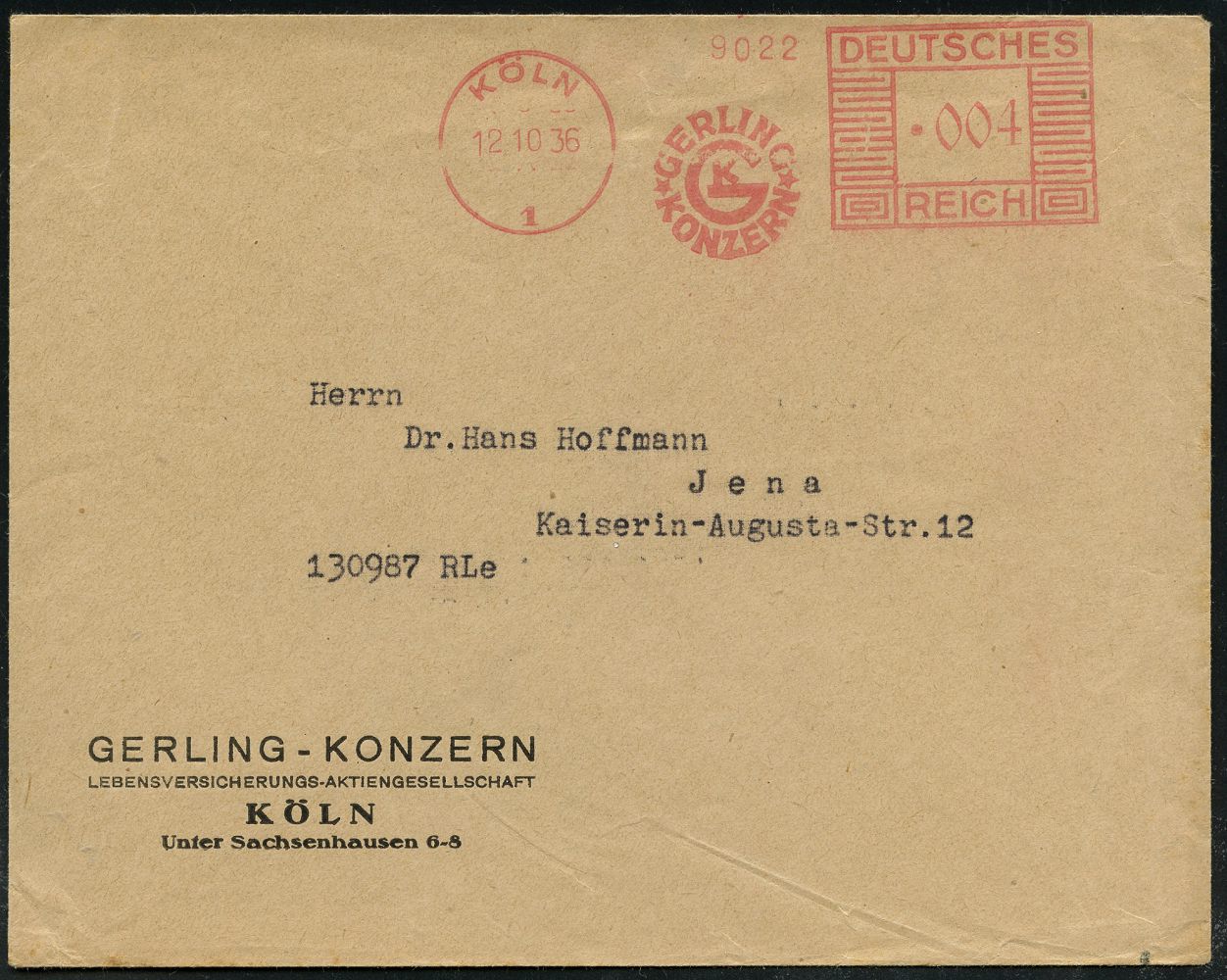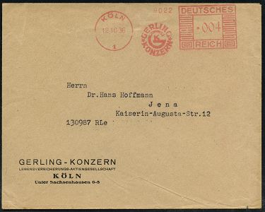 9194 | 18 € | 5000 KÖLN (Absender-Freistempel) : KÖLN/ 1/ GERLING/ KONZERN/ GK 1936 (12.10.) AFS Francotyp "Mäanderrechteck" (Monogr.-Logo) Firmen-Bf.: GERLING-KONZERN, LEBENSVERSICHERUNG-AG.. (Dü.E-2Ah = seltene Type) | ![]() | |