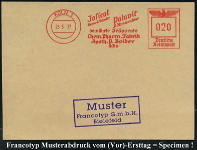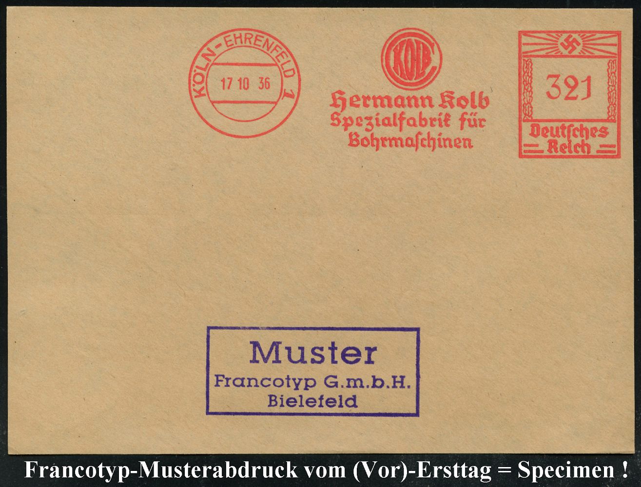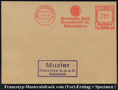 9195 | 35 € | 5000 KÖLN (Absender-Freistempel) : KÖLN-EHRENFELD 1/ KOLB/ Hermann Kolb/ Spezialfabrik für/ Bohrmaschinen 1936 (17.10.) AFS-Musterabdruck Francotyp "Hakenkreuz" (Monogr.-Logo) glasklar gest. Francotyp-Musterblatt vom (Vor)-Ersttag !, selten! (Dü.E-3CEo) | ![]() ![]() | |