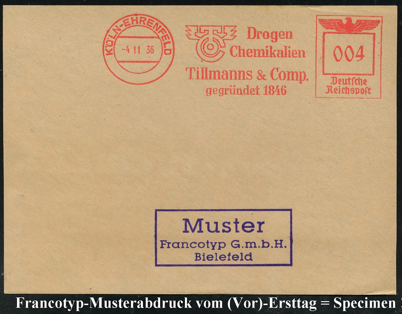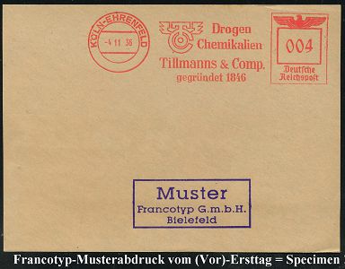 9196 | 35 € | 5000 KÖLN (Absender-Freistempel) : KÖLN-EHRENFELD/ TC/ Drogen/ Chemikalien/ Tillmanns & Comp.. 1936 (4.11.) AFS-Musterabdruck Francotyp "Reichsadler" (Monogr.-Logo) glasklar gest. Francotyp-Musterbklatt vom (Vor)-Ersttag !, selten! (Dü.E-5CEo) | ![]() ![]() | |