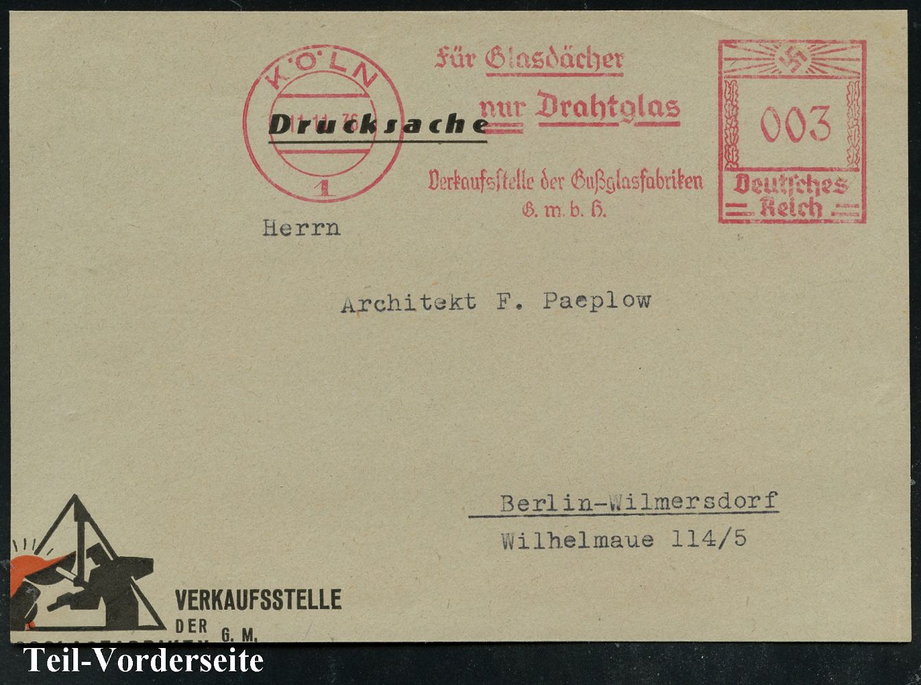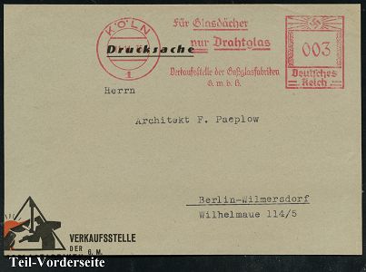 9197 | 15 € | 5000 KÖLN (Absender-Freistempel) : KÖLN/ 1/ Für Glasdächer/ nur Drahtglas/ Verkaufsstelle der Gußglasfabriken/ GmbH 1936 (11.11.) AFS Francotyp "Hakenkreuz" auf Teil-Vorderseite (Dü.E-3CEo) | ![]() | |