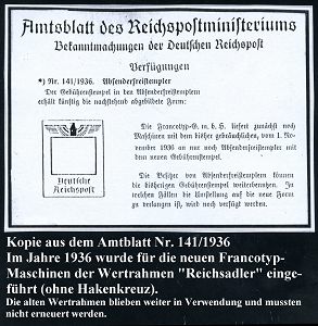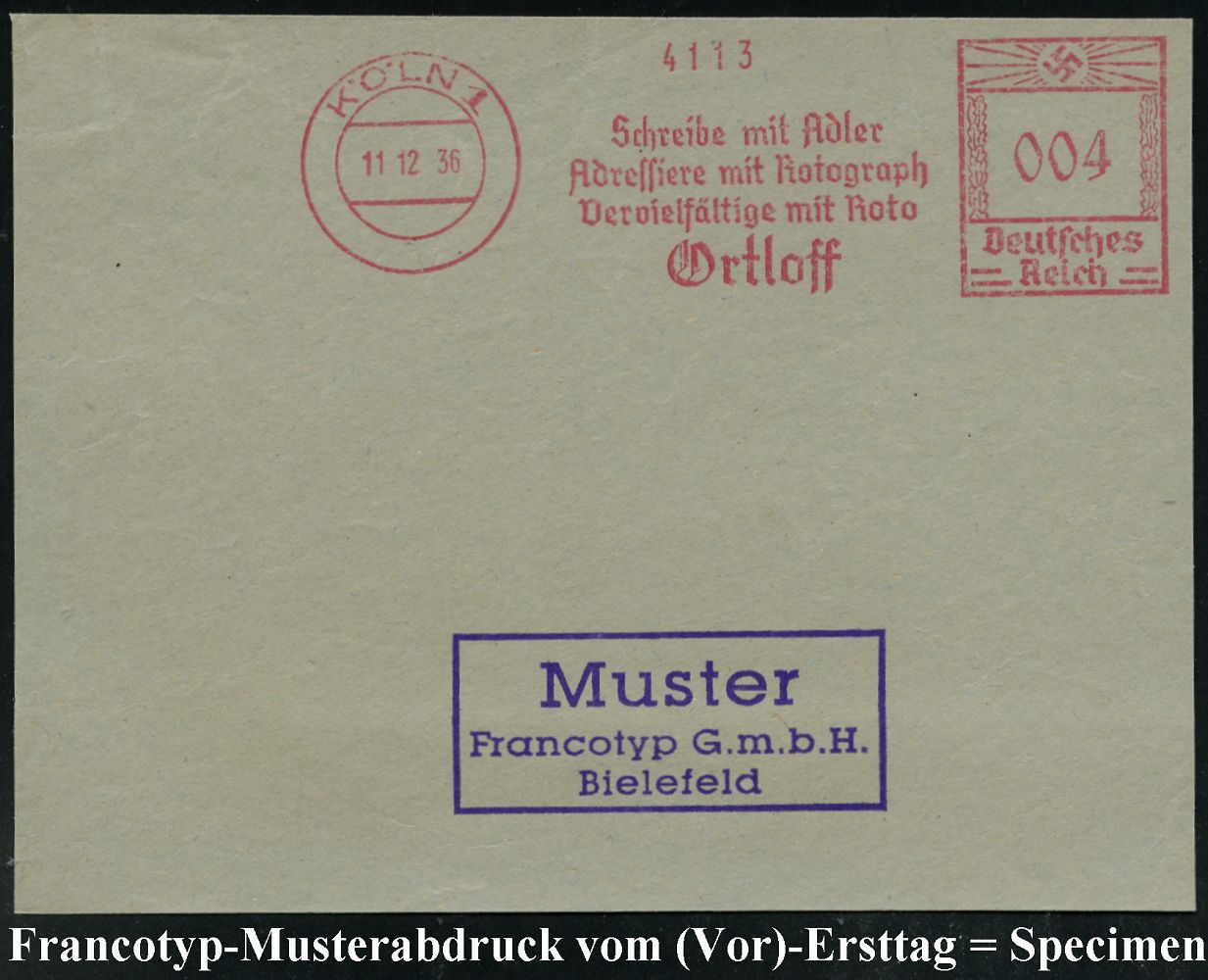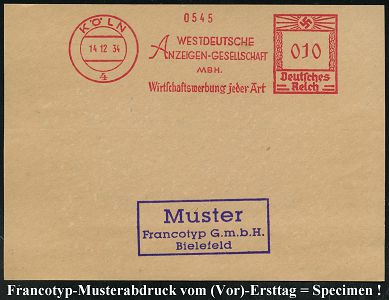 9160 | 35 € | 5000 KÖLN (Absender-Freistempel) : KÖLN/ 4/ WESTDEUTSCHE/ ANZEIGEN-GESELLSCHAFT/ MBH/ Wirtschaftswerbung.. 1934 (14.12.) AFS-Musterabdruck Francotyp "Hakenkreuz" , glasklar gest. Francotyp-Musterblatt vom (Vor)-Ersttag !, selten! (Dü.E-3CEh) | ![]() ![]() | |