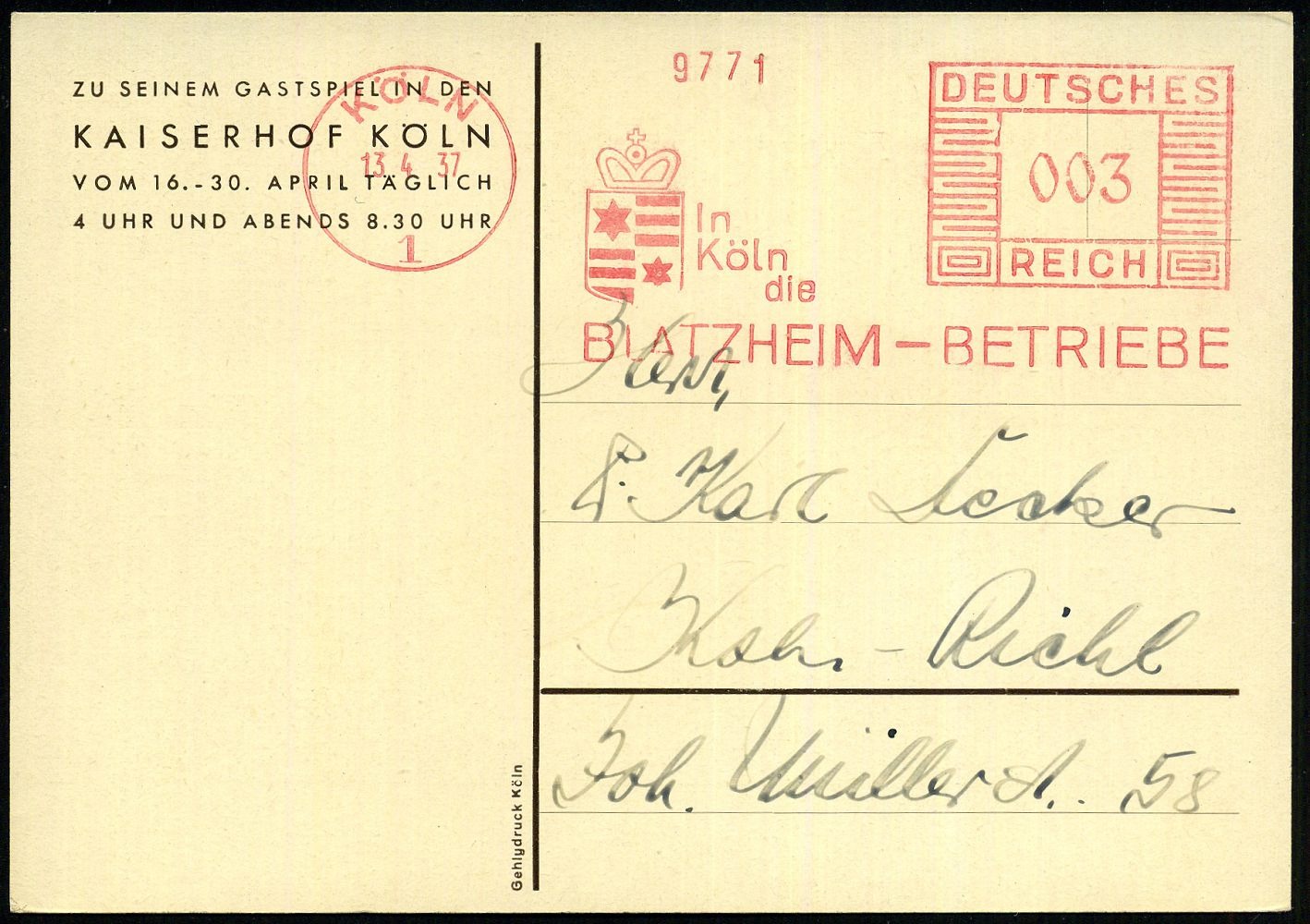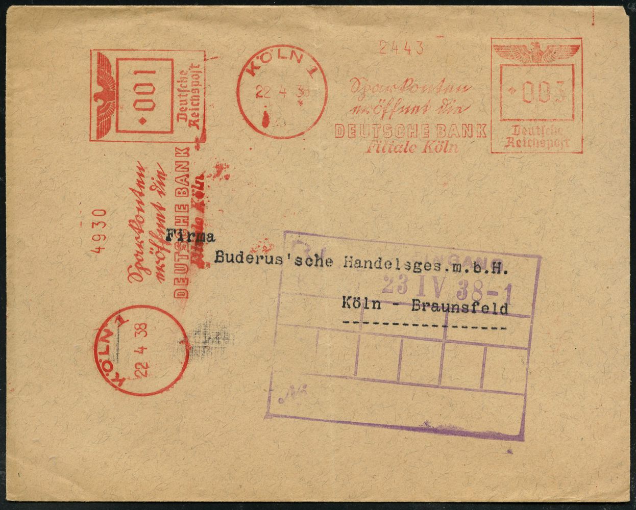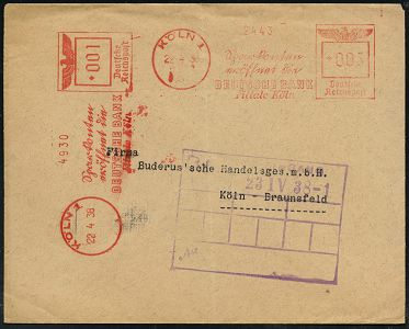 9230 | 20 € | 5000 KÖLN (Absender-Freistempel) : KÖLN 1/ Sparkonten/ eröffnet die/ DEUTSCHE BANK/ Filiale Köln 1938 (22.4.) AFS Francotyp "Reichsadler" 003 Pf. + 001 Pf. = 2 Abdrucke !, Text teils Sütterlin , Orts-Firmen-Bf. (schwache Falte) rs. Abs.-Vordruck, Orts-Bf. (Dü.E-5DGh) | ![]() | |