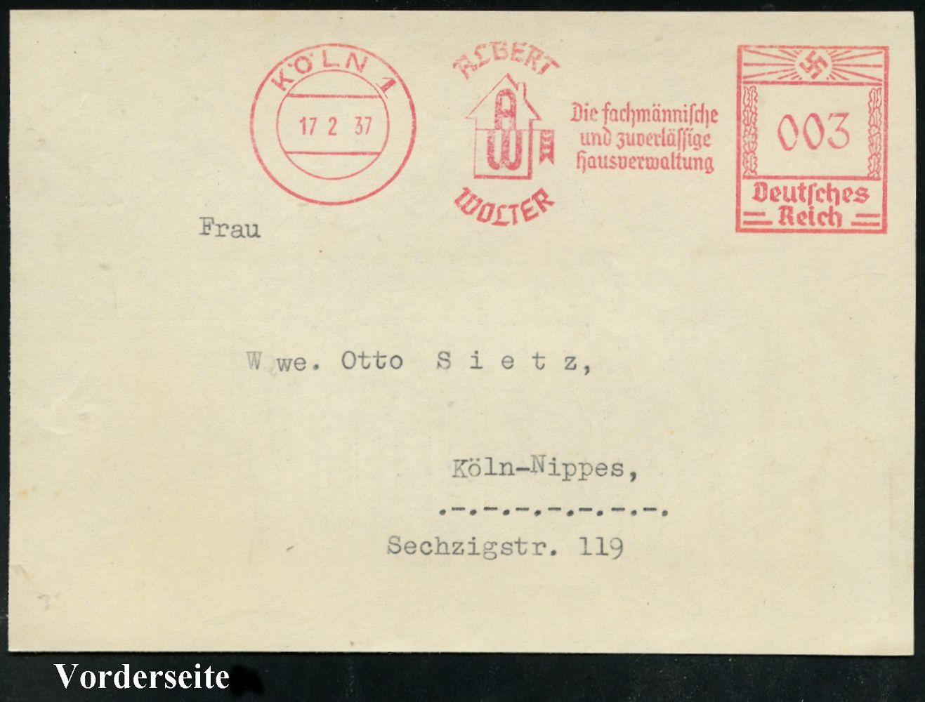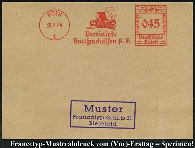 9153 | 35 € | 5000 KÖLN (Absender-Freistempel) : KÖLN/ 1/ Vereinigte/ Bausparkassen A.G. 1934 (20.8.) AFS-Musterabdruck Francotyp "Hakenkreuz" (Einfamilienhaus) glasklar gest. Francotyp-Musterblatt vom (Vor)-Ersttag !, selten! (Dü.E-3BAo) | ![]() ![]() | |