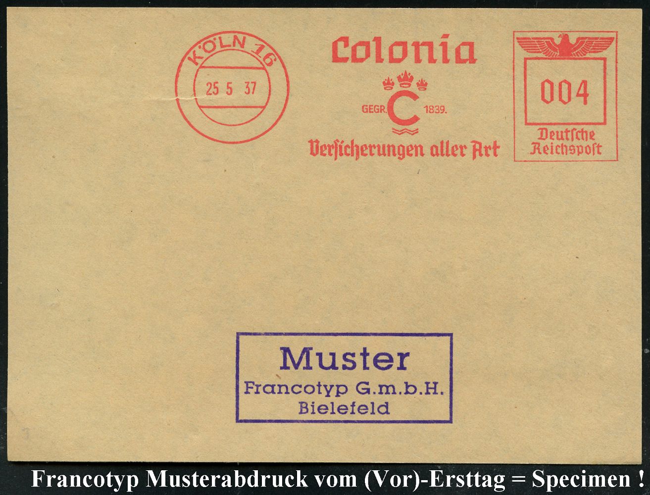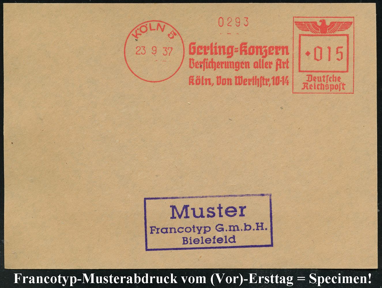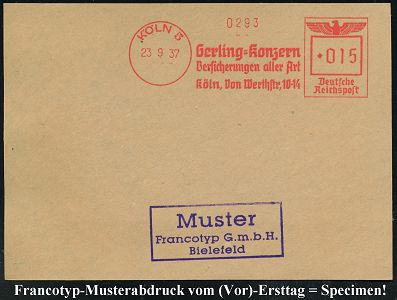 9221 | 35 € | 5000 KÖLN (Absender-Freistempel) : KÖLN 5/ Gerling-KONZERN/ Versicherungen aller Art.. 1937 (23.9.) AFS-Musterabdruck Francotyp "Reichsadler" , glasklar gest. Francotyp-Musterblatt vom (Vor)-Ersttag !, selten! (Dü.E-5DGh) | ![]() ![]() | |