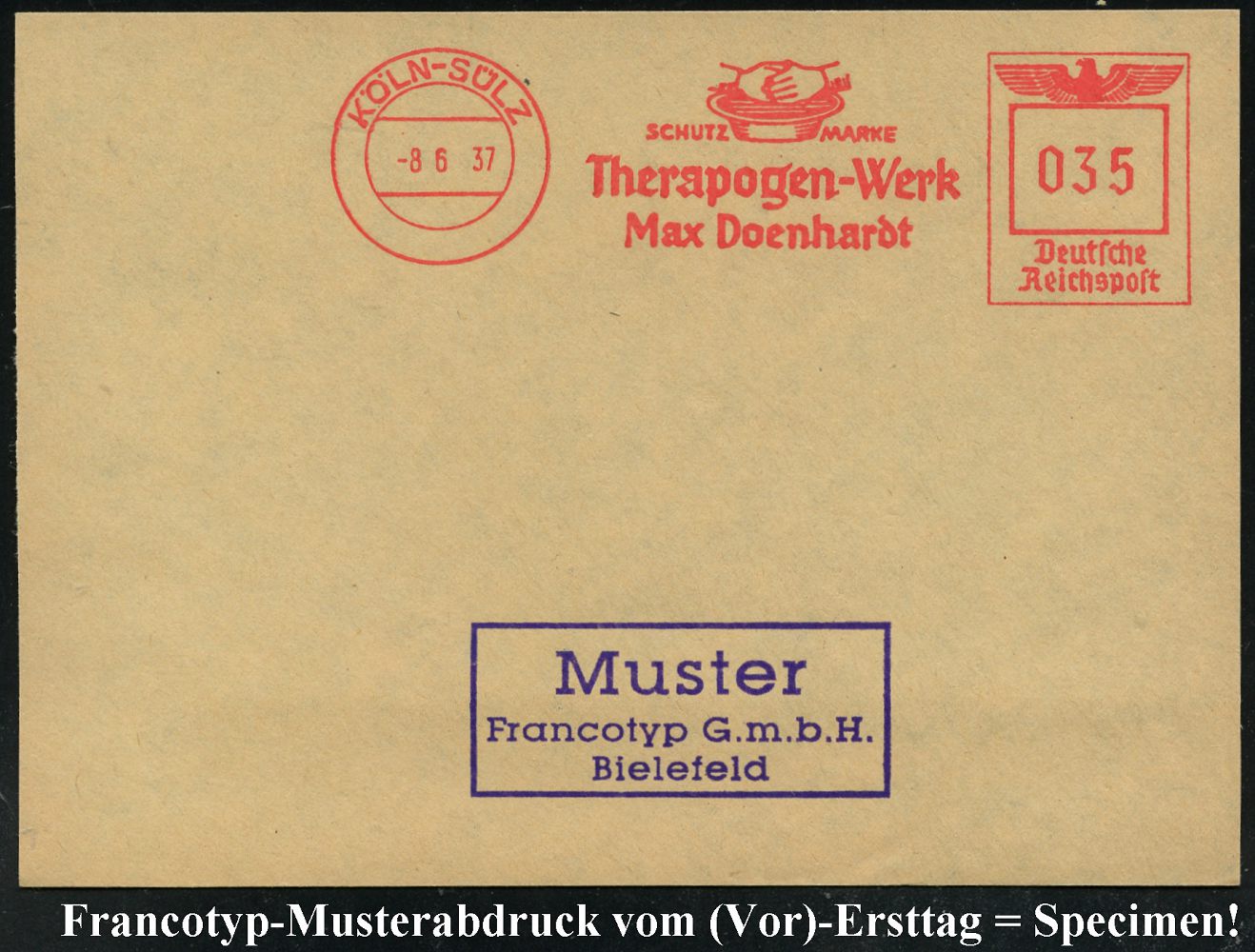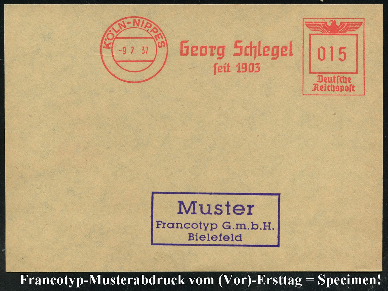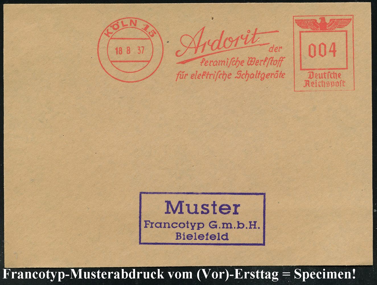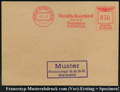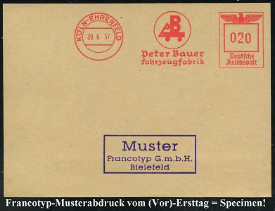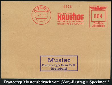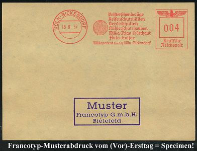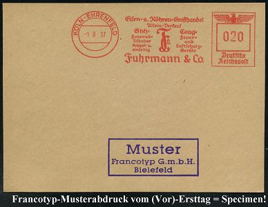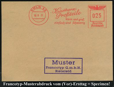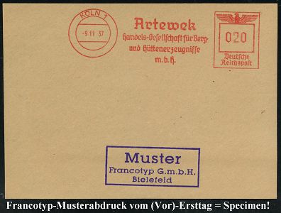 9225 | 35 € | 5000 KÖLN (Absender-Freistempel) : KÖLN 1/ Artewek/ Handels-Gesellschaft für Berg-/ u.Hüttenerzeugnisse/ mbH 1937 (9.11.) AFS-Musterabdruck Francotyp "Reichsadler" , glasklar gest. Francotyp-Musterblatt vom (Vor)-Ersttag !, selten! (Dü.E-5CGo) | ![]() ![]() | |