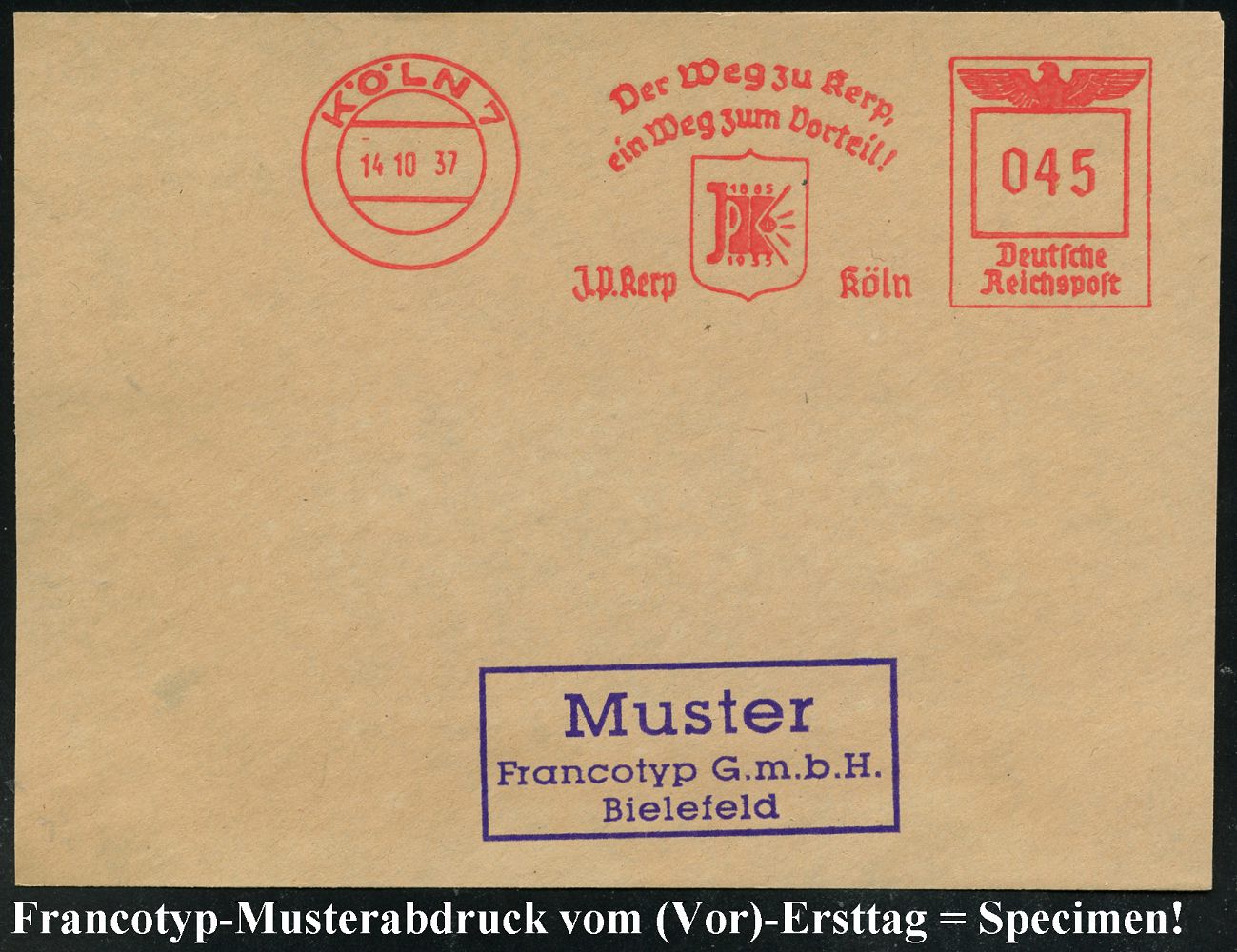 9222 | 35 € | 5000 KÖLN (Absender-Freistempel) : KÖLN 7/ Der Weg zu Kerp,/ ein Weg zum Vorteil!/ J.P.Kerp.. 1937 (14.10.) AFS-Musterabdruck Francotyp "Reichsadler" (Monogr.-Logo) glasklar gest. Francotyp-Musterblatt vom (Vor)-Ersttag !, selten! (Dü.E-5CGo) | ![]() ![]() | |