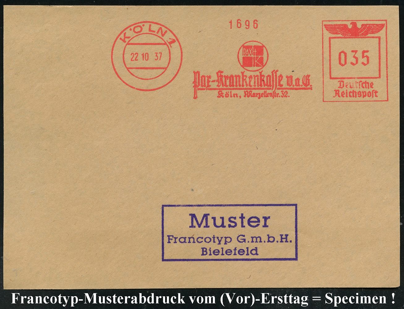 9223 | 35 € | 5000 KÖLN (Absender-Freistempel) : KÖLN 1/ PAX K/ Pax-Krankenkasse V.a.G.. 1937 (22.10.) AFS-Musterabdruck Francotyp "Reichsadler" (Monogramm-Logo mit Kreuz) glasklar gest. Francotyp-Musterblatt vom (Vor)-Ersttag !, selten! (Dü.E-5CGh) | ![]() ![]() | |