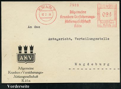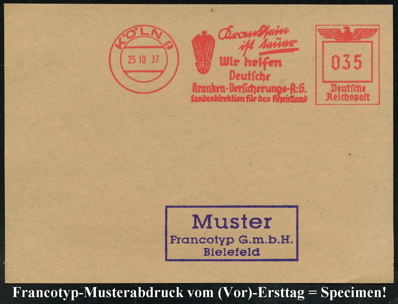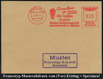 9224 | 35 € | 5000 KÖLN (Absender-Freistempel) : KÖLN 9/ Kranksein/ ist teuer/ DKV/ Wir helfen/ Deutsche/ Kranken-Versicherungs-A.G.. 1937 (25.10.) AFS-Musterabdruck Francotyp "Reichsadler", Text teils Sütterlin (Adler-Logo) glasklar gest. Francotyp-Musterblatt vom (Vor)-Ersttag !, selten! (Dü.E-5CGo) | ![]() ![]() | |