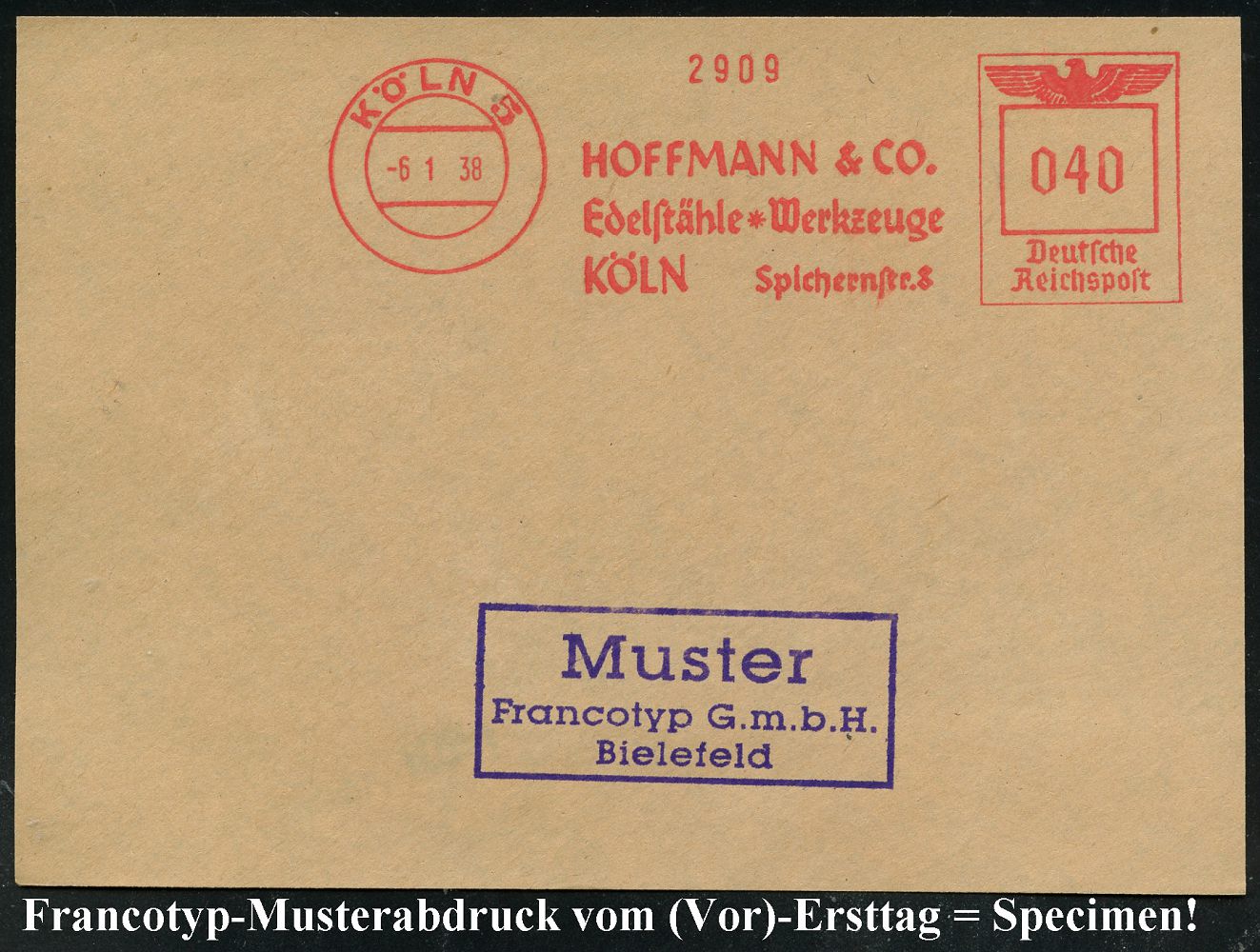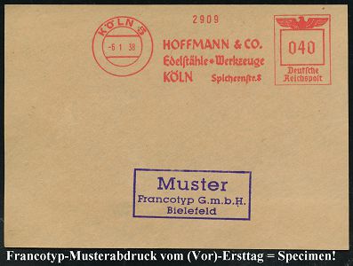 9227 | 35 € | 5000 KÖLN (Absender-Freistempel) : KÖLN 5/ HOFFMANN & CO./ Edelstähle * Werkzeuge.. 1938 (6.1.) AFS-Musterabdruck Francotyp "Reichsadler" , glasklar gest. Francotyp-Musterblatt vom (vor)-Ersttag !, selten! (Dü.E-5CGh) | ![]() ![]() | |