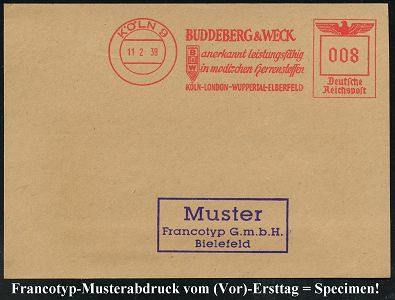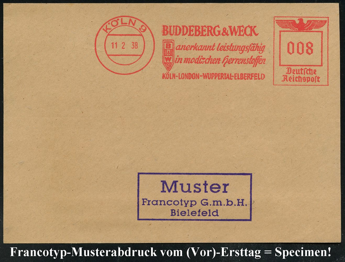 9229 | 35 € | 5000 KÖLN (Absender-Freistempel) : KÖLN 9/ BUDDEBERG & WECK/ anerkannt leistungsfähig/ in modischen Herrenstoffen/ KÖLN-LONDON-WUPPERTAL.. 1938 (11.2.) AFS-Musterabdruck Francotyp "Reichsadler" (Monogr.-Logo) glasklar gest. Francotyp-Musterblatt vom (Vor)-Ersttag !, selten! (Dü.E-5CGo) | ![]() ![]() | |