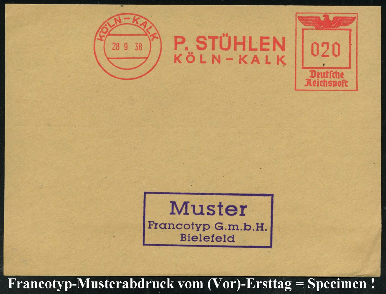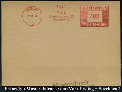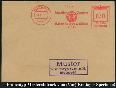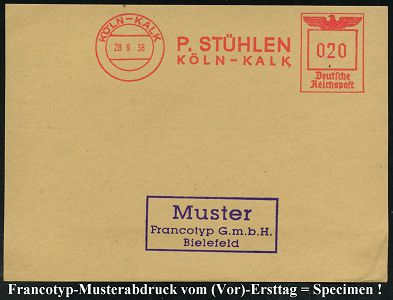 9235 | 35 € | 5000 KÖLN (Absender-Freistempel) : KÖLN-KALK/ P.STÜHLEN.. 1938 (28.9.) AFS-Musterabdruck Francotyp "Reichsadler" , glasklar gest. Francotyp-Musterblatt vom (Vor)-Ersttag !, selten! (Dü.E-5CGo) | ![]() ![]() | |
