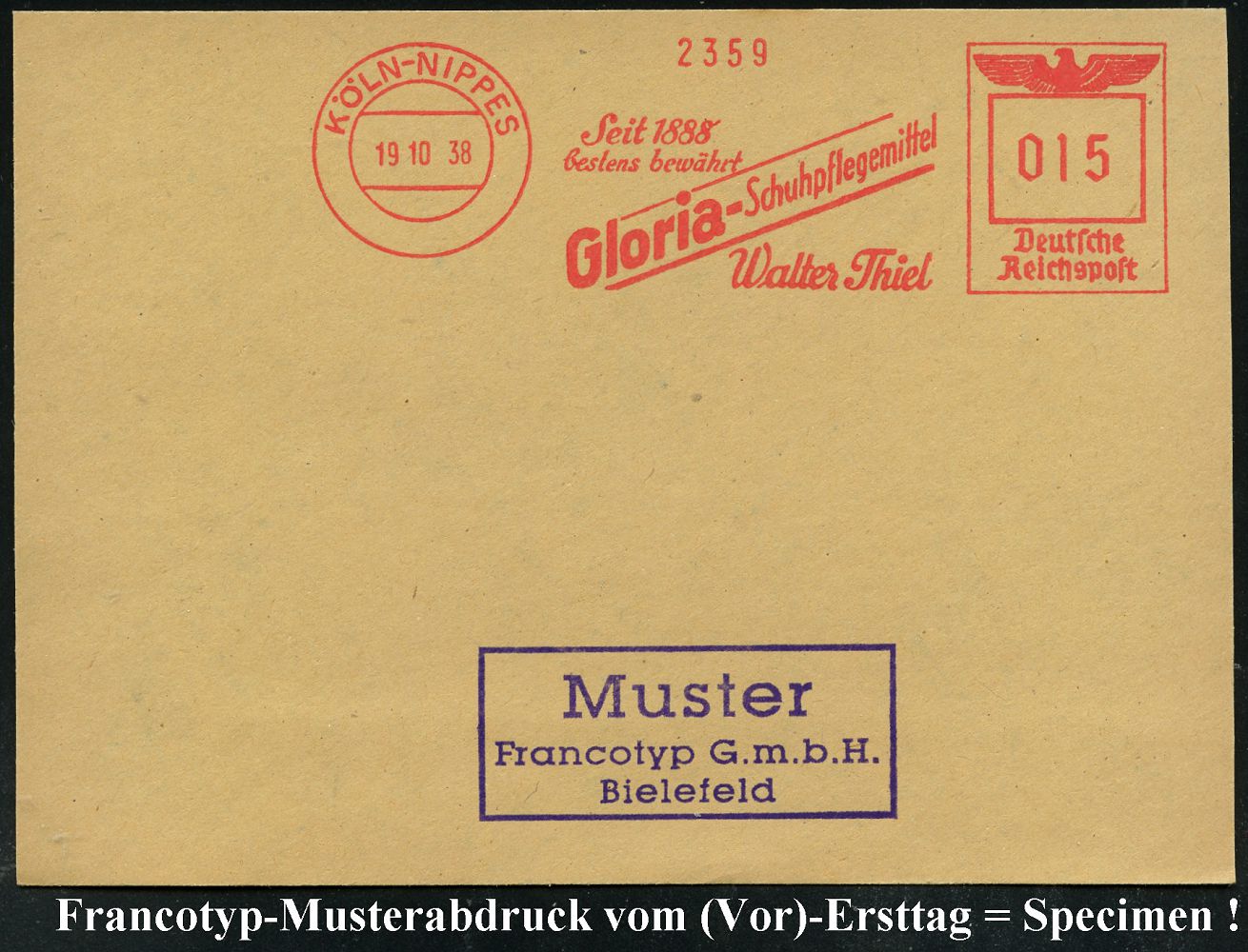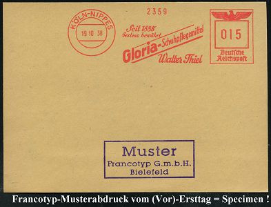 9237 | 35 € | 5000 KÖLN (Absender-Freistempel) : KÖLN-NIPPES/ Seit 1888../ Gloria-Schupflegemittel/ Walter Thiel 1938 (19.10.) AFS-Musterabdruck Francotyp "Reichsadler" , glasklar gest. Francotyp-Musterblatt vom (Vor)-Ersttag !, selten! (Dü.E-5CGh) | ![]() ![]() | |
