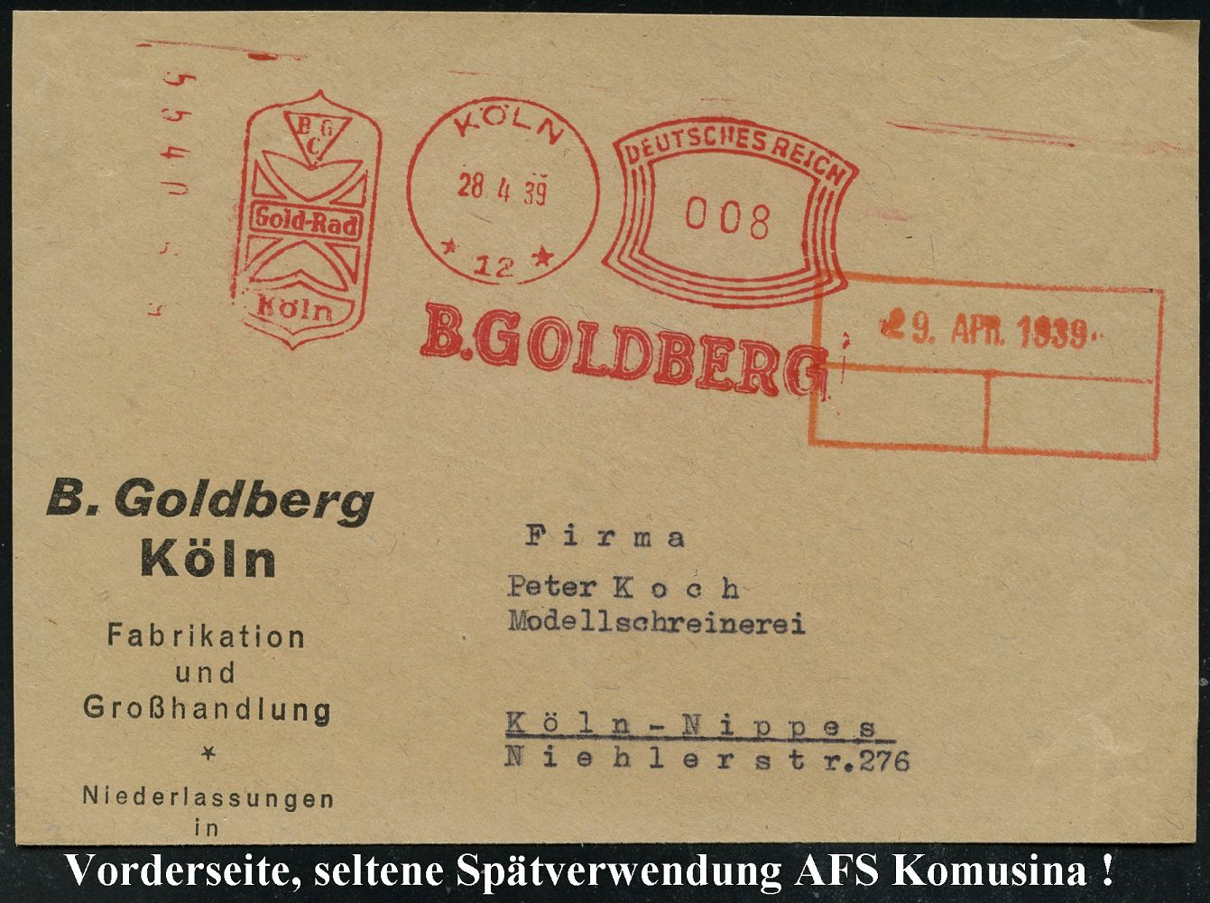 9242 | 25 € | 5000 KÖLN (Absender-Freistempel) : KÖLN/ *12*/ BGC/ Gold-Rad/ ..B.GOLDBERG 1939 (28.4.) seltener AFS Komusina "Bogenrechteck" (Firmen-Logo) Bedarfs-Vorderseite, die Firma Komusina ging 1930 in Konkurs, die Maschinen wurden von der Fa. Francotyp gewartet, = Spätverwendung Komusina-Frankiermaschine! (Dü.E-1 Ko) | ![]() | |