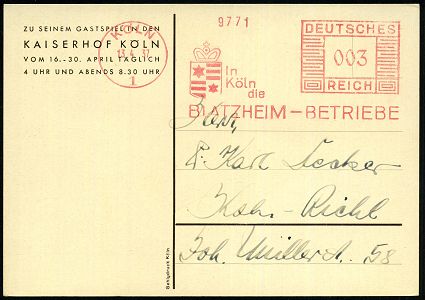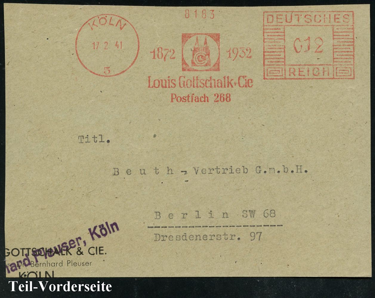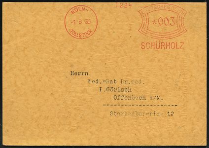 9254 | 15 € | 5000 KÖLN (Absender-Freistempel) : KÖLN/ 5/ 1872 1932/ Luois Gottschak + Cie.. 1941 (17.2.) AFS Francotyp "Mäanderrechteck" (Firmenlogo mit Kölner Dom) Firmen-Vorderseite (Dü.E-2CEh) | ![]() | |