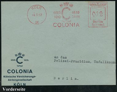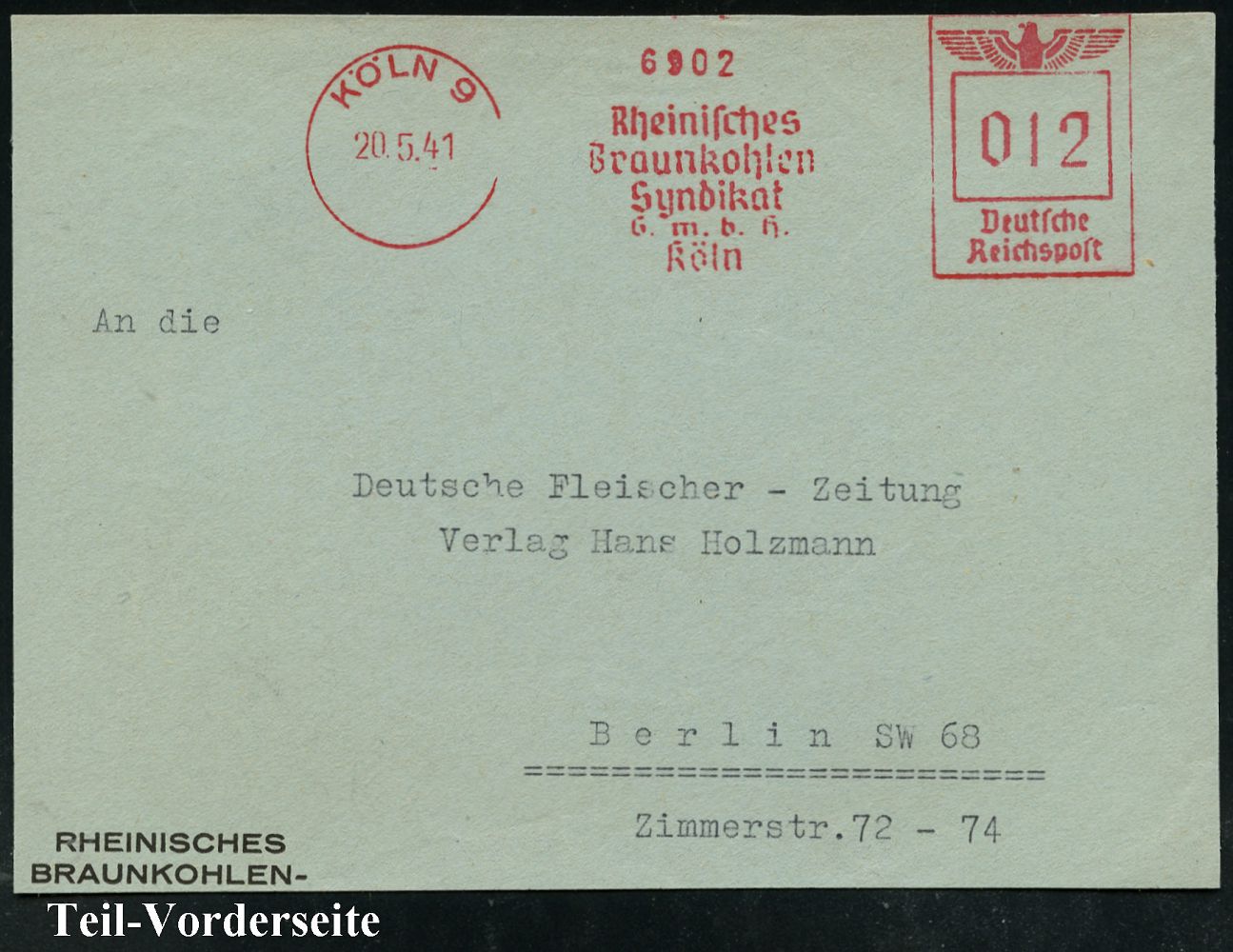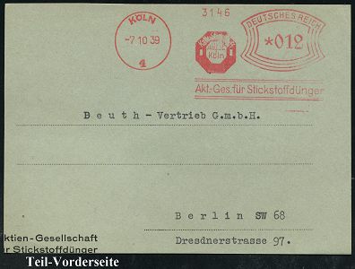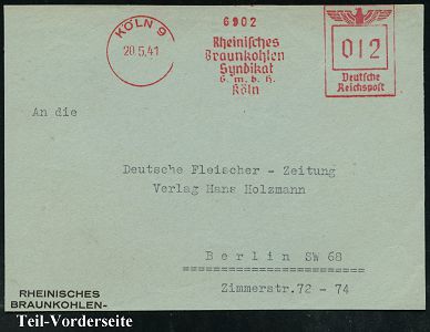 9255 | 14 € | 5000 KÖLN (Absender-Freistempel) : KÖLN 9/ Rheinisches/ Braunkohlen/ Syndikat/ GmbH 1941 (20.5.) AFS Francotyp "Reichsadler" , Teil-Vorderseite (Dü.E-5BGh) | ![]() | |