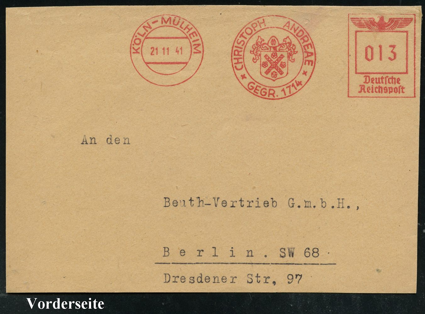 9257 | 15 € | 5000 KÖLN (Absender-Freistempel) : KÖLN-MÜLHEIM/ CHRISTOPH ANDREAE/ GEGR.1714 1941 (21.11.) AFS Francotyp "Reichsadler" (Wappen-Logo) Bedarfs-Vorderseite (Dü.E-5CGo) | ![]() | |