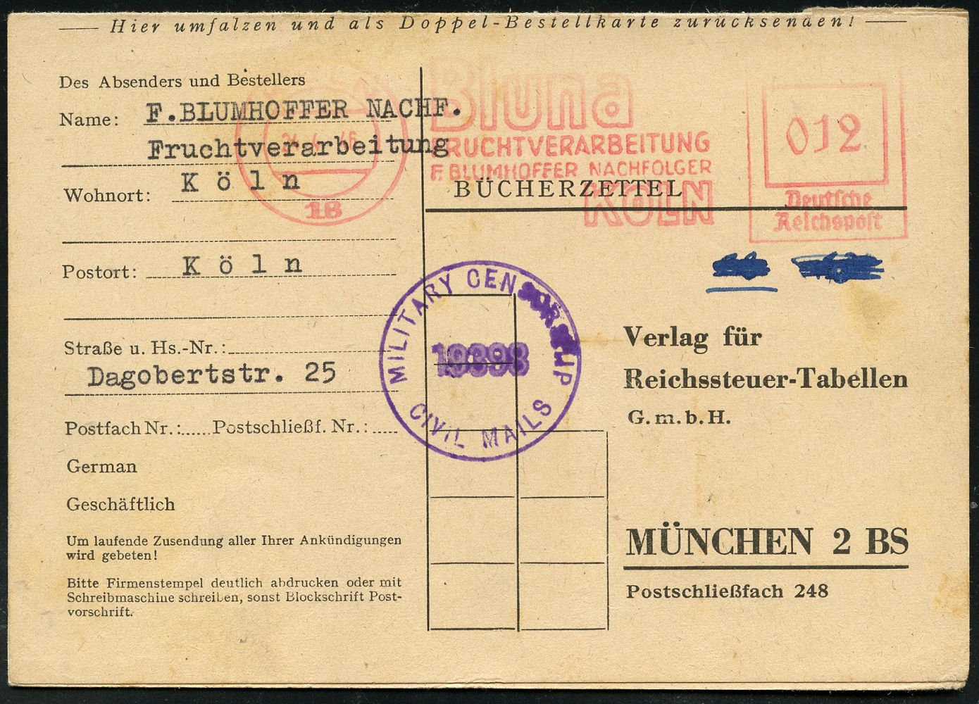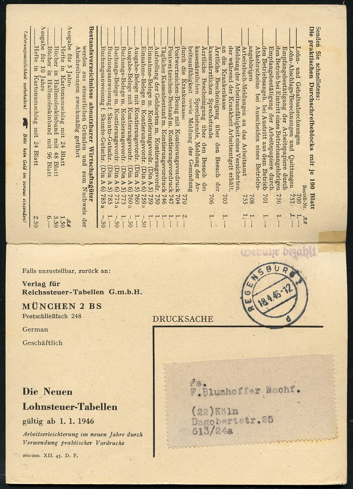 9262 | 25 € | 5000 KÖLN (Absender-Freistempel) : KÖLN/ 18/ Bluna/ FRUCHTVERARBEITUNG/ F.BLUMHOFER.. 1946 (24.4.) aptierter AFS Francotyp "Reichsadler" = entfernt = Notmaßnahme! + viol. Zensur-1K: MILITARY CENSORSHIP/19398/CIVIL MAILS (= Bonn, Rie.B-5) auf Antwort-Kt. + anhängende Antwort gebr. , 2K-Steg: REGENSBURG 2/d + 1L: Gebühr bezahlt, interssanter Inl.-Zensur-Beleg, Antwort ohne Zensur! (Dü.E-13A-107o) | ![]() ![]() ![]() | |