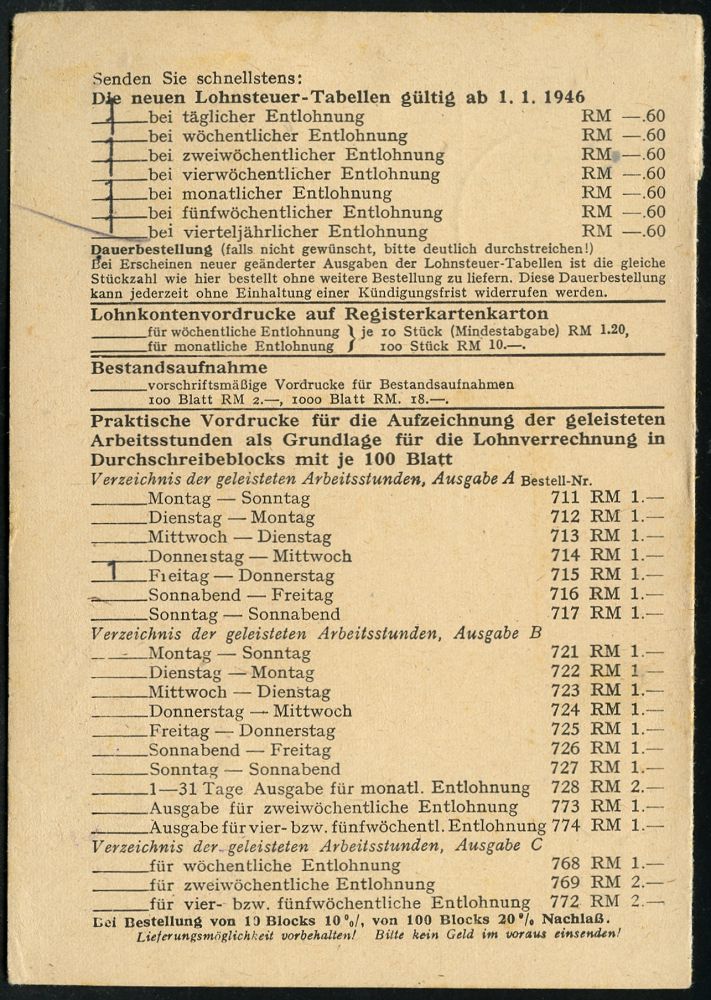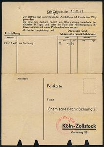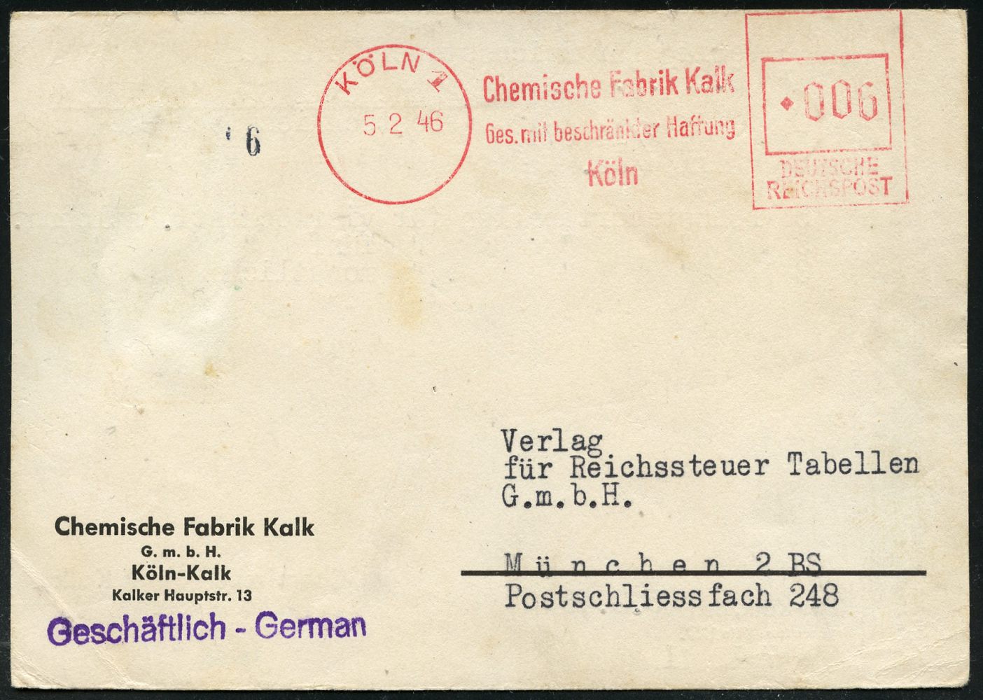 9273 | 25 € | 5000 KÖLN (Absender-Freistempel) : KÖLN 1/ Chemische Fabrik Kalk/ Ges.mit beschränkter Haftung.. 1946 (5.2.) aptierter AFS Francotyp ANTIQUA "Reichsadler" = entfernt = Notmaßnahme! , Firmen-Kt. (kl. Eckbugspur) n. München (Dü.E-14 C-231o) | ![]() | |