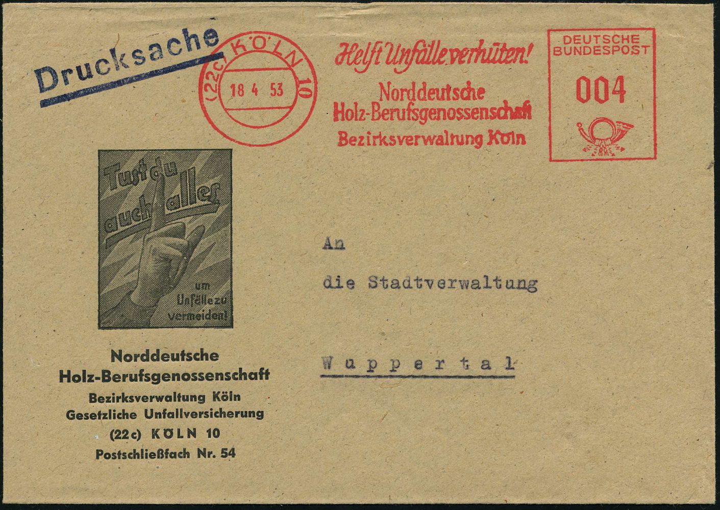9279 | 18 € | 5000 KÖLN (Absender-Freistempel) : (22c) KÖLN 10/ Helft Unfälle verhüten!/ Norddt./ Holz-Berufsgenossenschaft 1953 (18.4.) AFS Francotyp "Posthorn" klar auf Anti-Unfall-Reklame-Bf.! (Dü.E-23CG) | ![]() | |