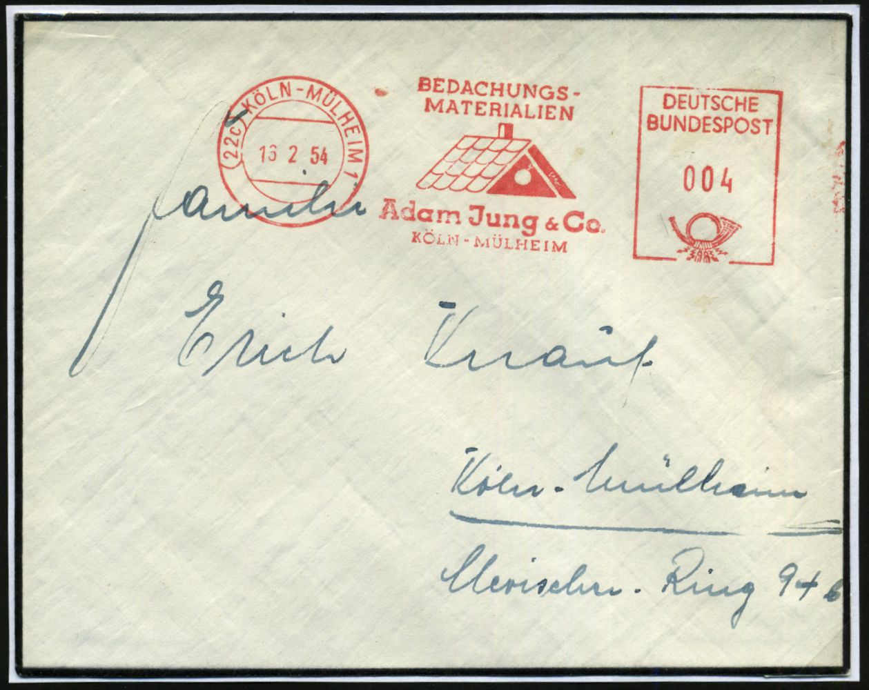 9282 | 20 € | 5000 KÖLN (Absender-Freistempel) : (22c) KÖLN-MÜLHEIM 1/ BEDACHUNGS-/ MATERIALIEN/ Adam Jung & Co. 1954 (16.2.) AFS Postalia (Hausdach mit Kamin) auf unbeanstandetem Firmen - T r a u e r - Bf. + Inhalt!, AFS = postalisch unzulässig!, 2 Belege kompl.! (Dü.E-23 B) | ![]() ![]() ![]() | |