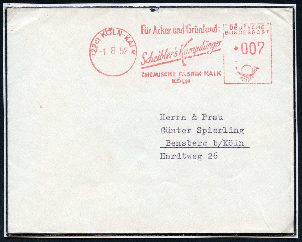 9286 | 15 € | 5000 KÖLN (Absender-Freistempel) : (22 c) KÖLN-KALK/ Für Acker u.Grünland/ Scheibler´s Kampdünger/ CHEMISCHE FANRIK KALK 1957 (1.8.) AFS Francotyp auf Trauer-Bf. = AFS auf Trauerpost postalisch unzulässig! , unbeanstandeter Fern-Bf. n. Bensberg (Dü.E-23DO) | ![]() | |